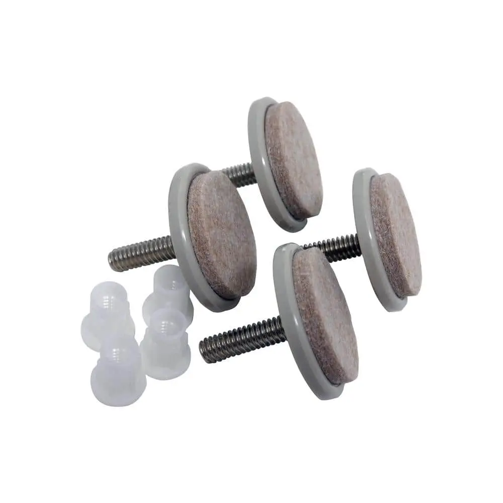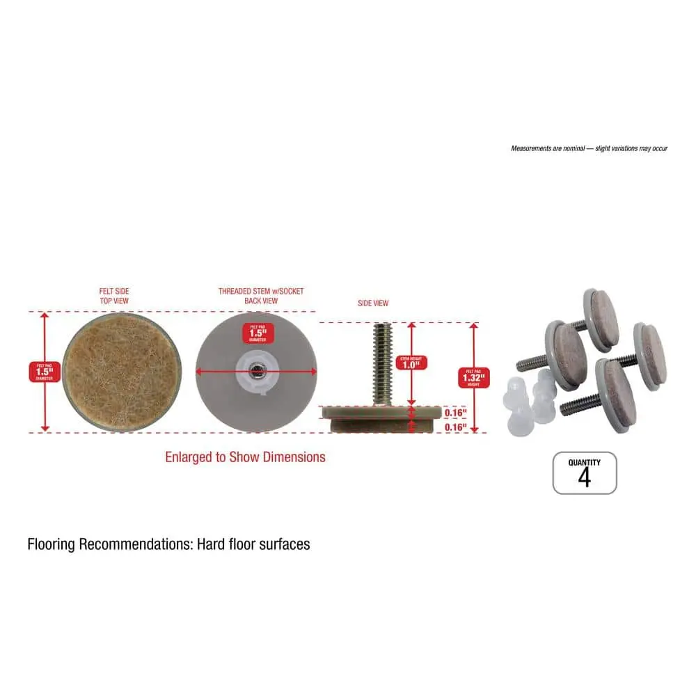 The 1-1/2 in. Felt Guard Plus Round Felt Threaded Stem Glides (4 per pack) are ideal for displays, office equipment, and household furniture with threaded sockets. These glides feature felt bottoms that minimize friction and noise while preventing scratches on hardwood and laminate floors. They are easy to attach using 1/4 in. x 20 x 1 in. threaded stems and provide excellent floor protection with the added benefit of adjustable height.
