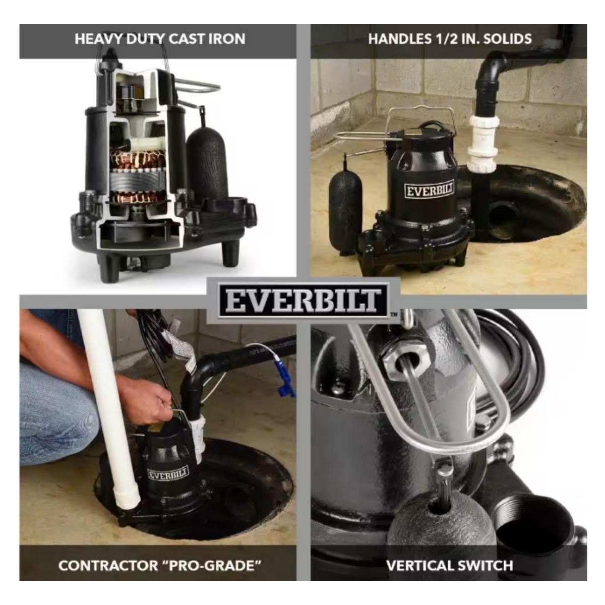 The Everbilt 1/2 HP submersible pump is made of durable cast iron and includes a PSC motor to promote energy efficiency and cost savings. The HDS50 comes with fasteners made of corrosion-resistant stainless steel, while the pump itself is safeguarded by a powder-coated epoxy finish.
