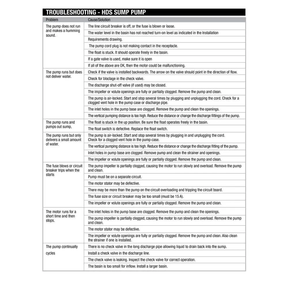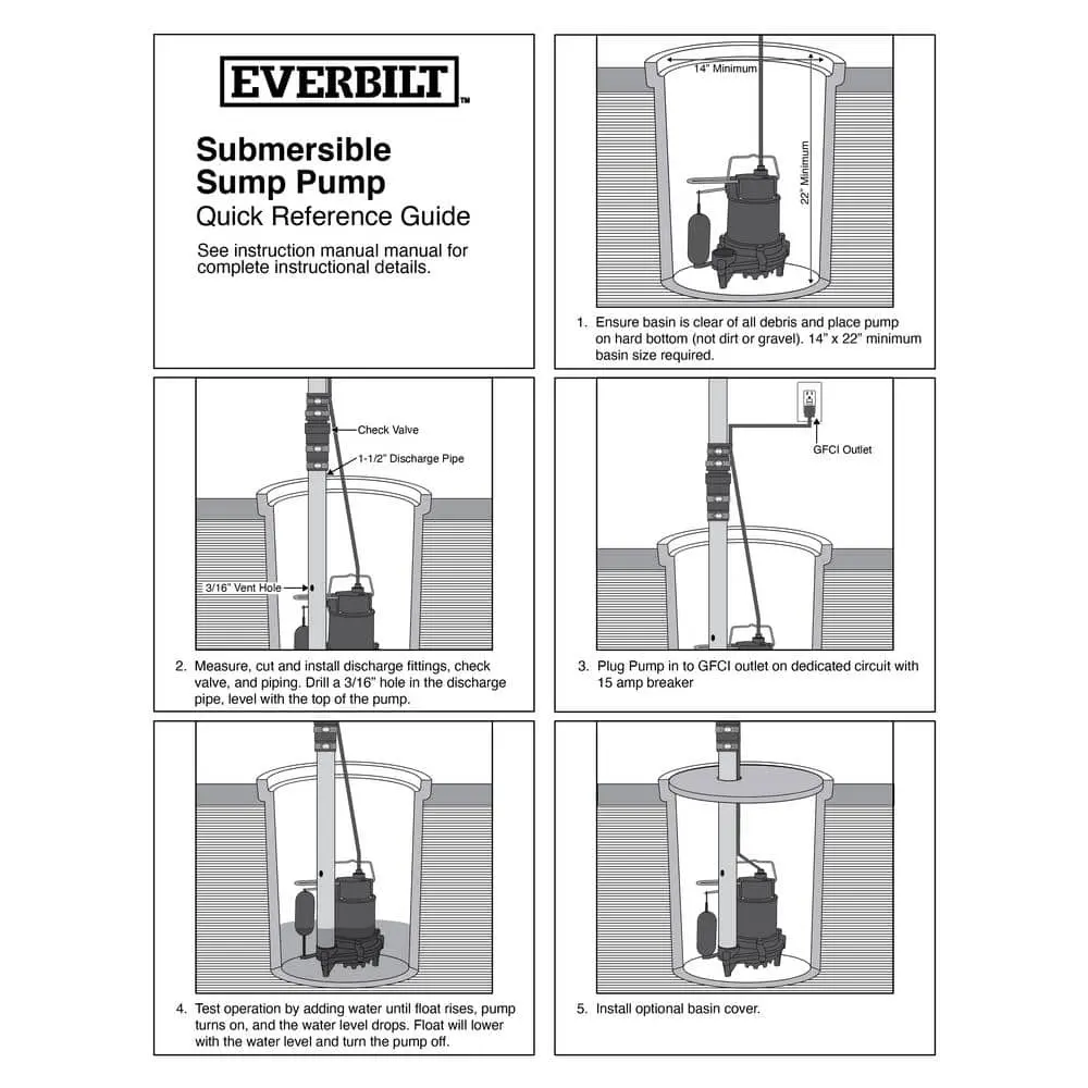 The Everbilt 1/2 HP submersible pump is designed for reliable, energy-efficient performance. Constructed with heavy-duty cast iron, it features a PSC motor for enhanced efficiency and savings. The corrosion-resistant stainless steel fasteners and powder-coated epoxy finish ensure long-lasting protection. The HDS50 model is built to pass 1/2 in. solids and utilizes a vortex non-clogging impeller, making it perfect for sump, effluent, and dewatering applications, including basement sumps, mound systems, and septic tanks.