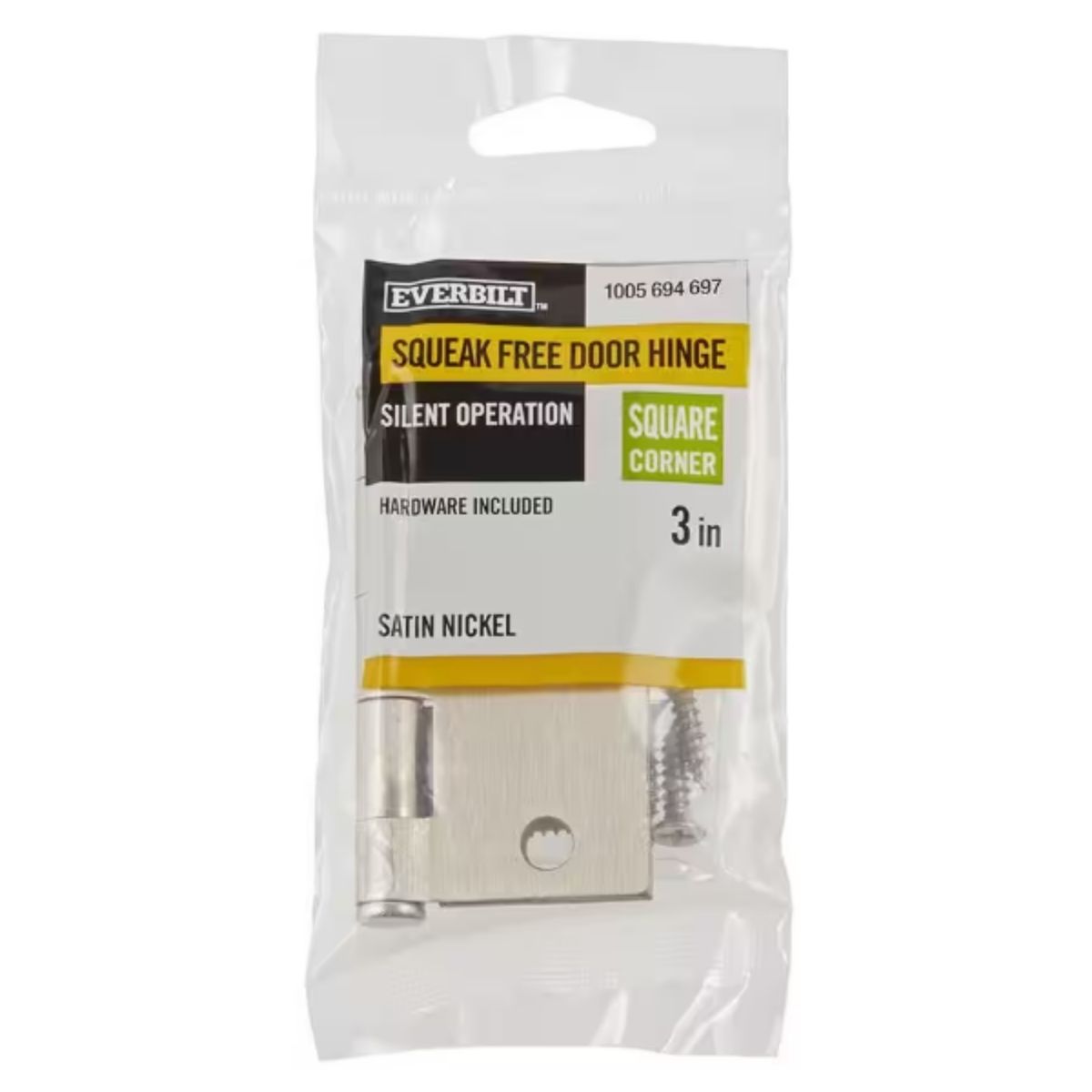 The Everbilt 3 in. corner door hinge is easy to install, perfect for residential doors. Made of steel with a satin nickel finish, it features a 5-knuckle, full mortise design and a removable pin for effortless installation or door removal.Squeak-free door hinge for quiet operationGrease-packed door hinge pin for long-lasting smooth functionSatin nickel finish adds a beautiful touch to your home decor