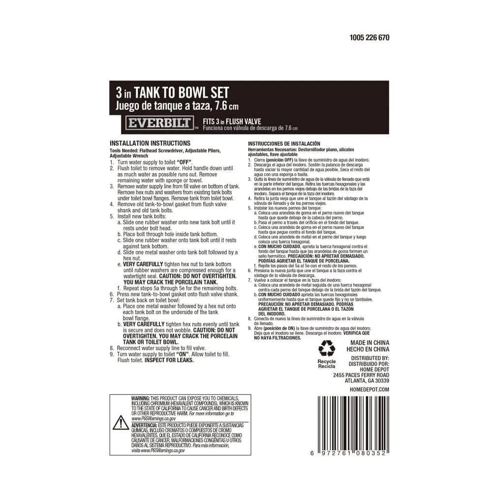This 3 in. Tank-to-Bowl Kit helps prevent leaks between your toilet tank and bowl. The 15-piece kit includes 2 zinc-plated galvanized steel bolts, a 3 in. rubber gasket, and washers. By stopping leaks, it helps save water, energy, and money.