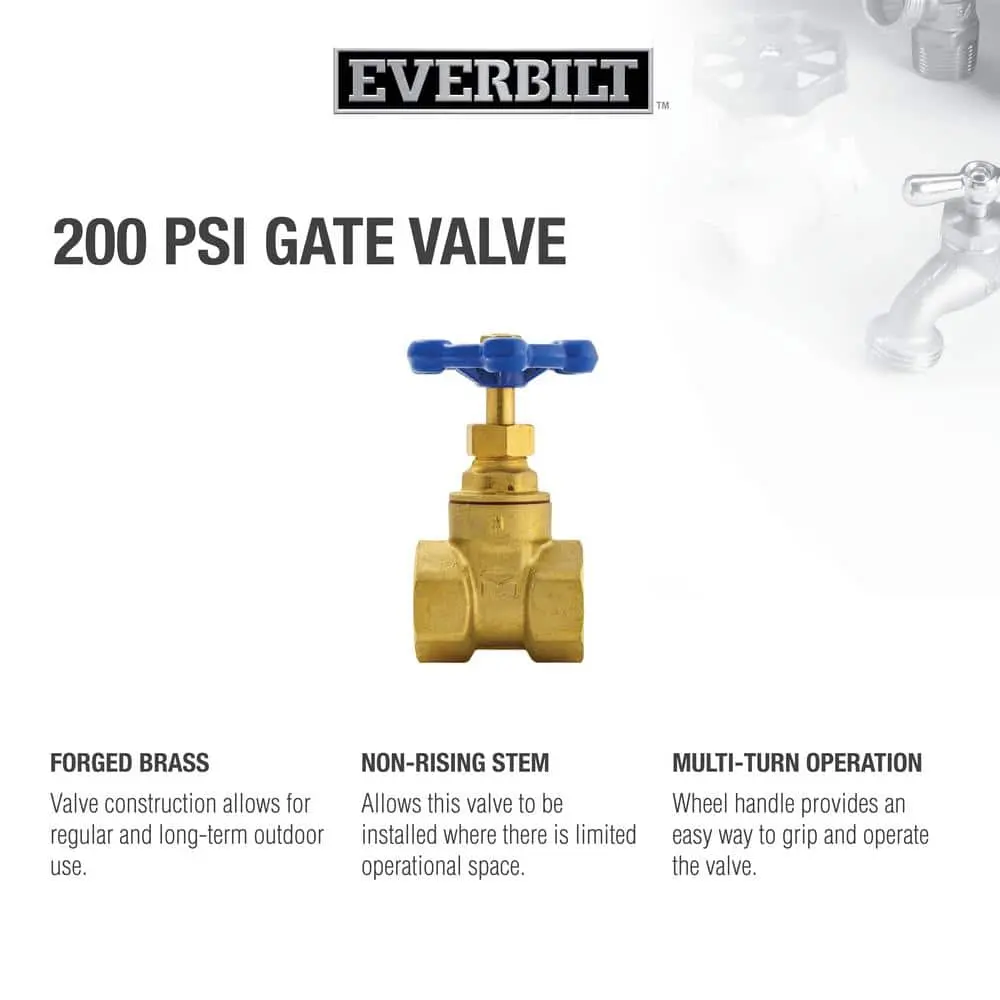 The Everbilt Brass FIP Compact-Pattern Threaded Gate Valve is designed with an FIP connection and offers a maximum working pressure of 200 PSI/125 WSP. Crafted from lead-free forged brass, it ensures quality and reliability. Proline valves are trusted for performance across a range of residential, commercial, and industrial applications.
