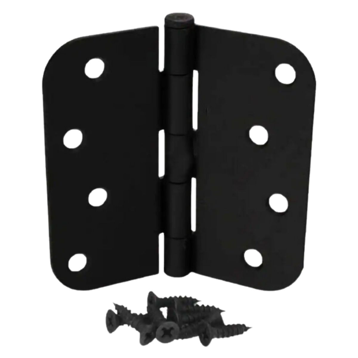 The Everbilt 4 in. x 5/8 in. Radius Door Hinge is easy to install with its 5 knuckle full mortise design. Made of durable steel, it has a matte black finish for a sophisticated look. The removable pin allows for easy door removal and installation.Squeak-free door hinge for quiet operationGrease-packed door hinge pin for long-lasting smooth functionMatte black finish adds a beautiful touch to your home decor