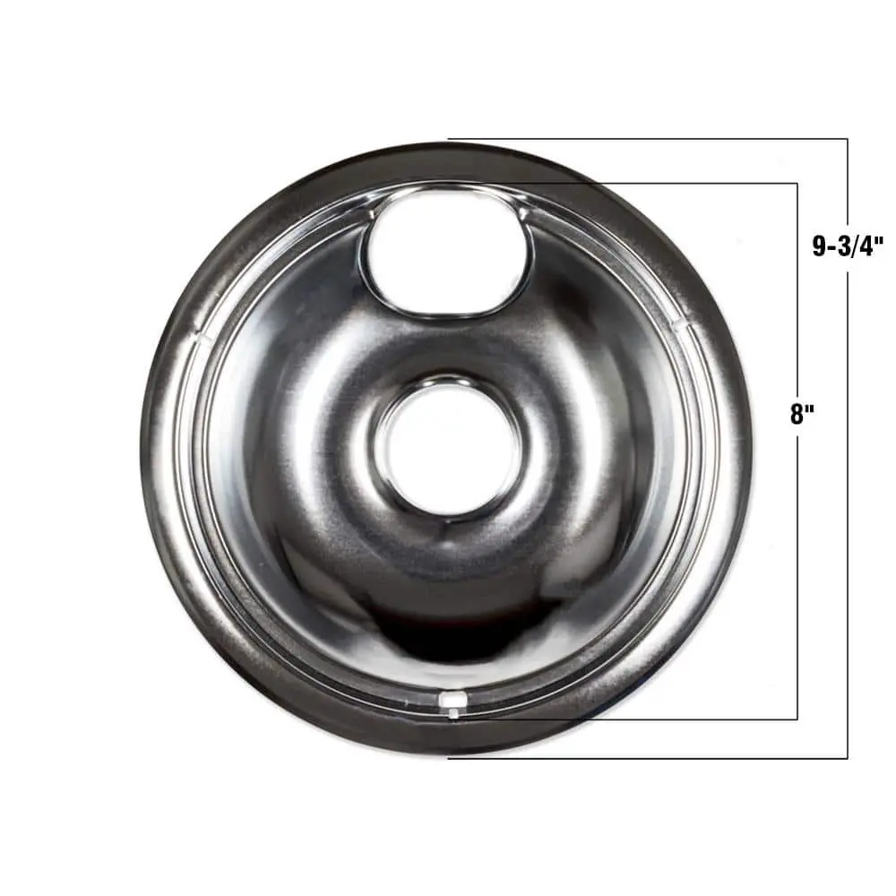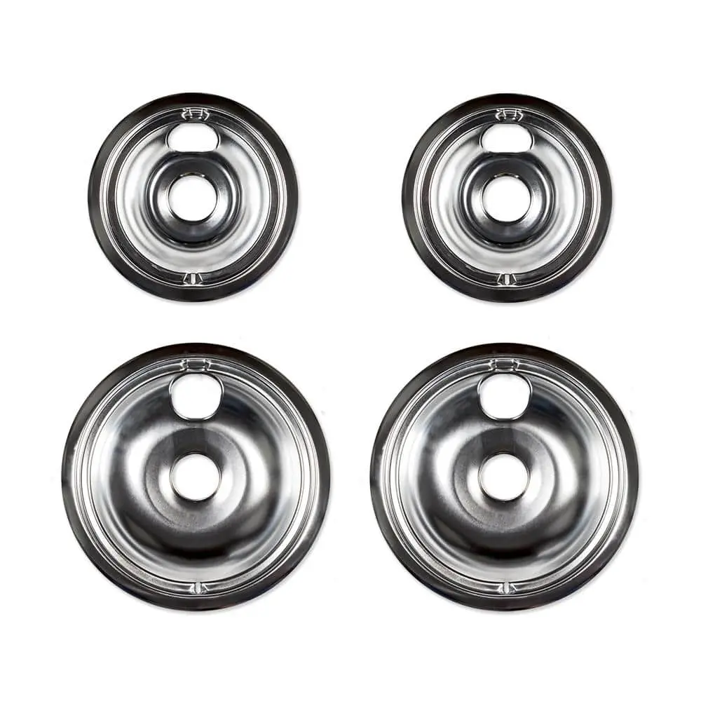 The Everbilt 4-pack chrome drip bowls are designed to catch cooking drips, helping to maintain a clean stove. They are compatible with most GE and Hotpoint plug-in electric ranges. Regularly replacing your stove's drip bowls not only gives it a refreshed look but also promotes more even cooking by improving heat distribution. The chrome finish enhances heat reflectivity, contributing to better meal preparation. With a combined ring and pan design, these one-piece drip bowls are easy to clean and replace. This set includes two 8-inch bowls and two 6-inch bowls.