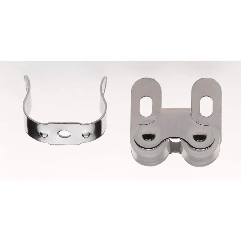 This nickel-plated latch with a C-clip catch is ideal for furniture and vanity doors. Featuring two nylon rollers, it quietly catches the door, preventing noisy banging. Installation is simple with the included screws for easy screw-on mounting.