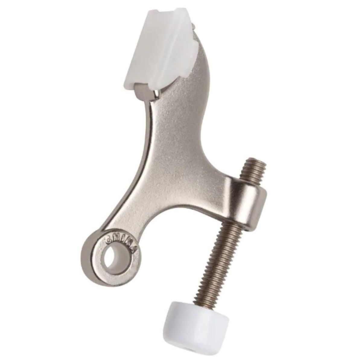 The Everbilt Hinge Pin Doorstop stays in place using a hinge pin and has a self-adjusting pad that fully contacts the door. It also features an oversized bumper on an adjusting screw for door trim protection.Hinge pin door stop fits most standard door hingesImproved self-adjusting pad helps prevent damage to your doorsSatin nickel finish adds a beautiful touch to your home decor