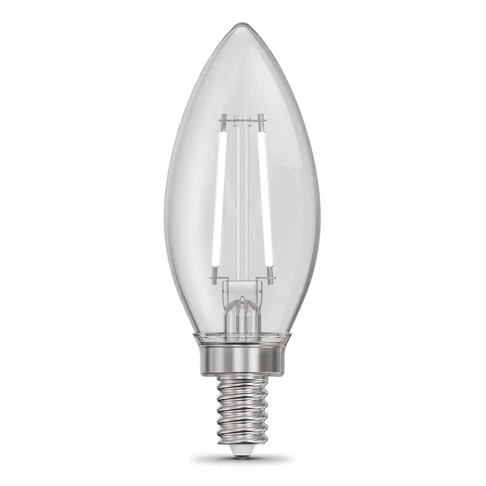Enhance your lighting with Feit Electric's Exposed White Filament Torpedo B10 LED Bulbs, designed for a stylish, modern touch. These innovative bulbs feature a clear glass design with discreet white filaments, blending seamlessly into any décor. The dimmable 2700K Soft White glow creates a warm, inviting atmosphere without harsh glare. Perfect for chandeliers, wall sconces, coach lanterns, and other fixtures with a Candelabra E12 base, these bulbs deliver 1000 lumens of brightness while consuming just 10 watts, offering up to 90% energy savings compared to traditional 100-watt incandescent bulbs. With a 90+ CRI, they bring out more vibrant, true-to-life colors, instantly elevating any home or commercial space.