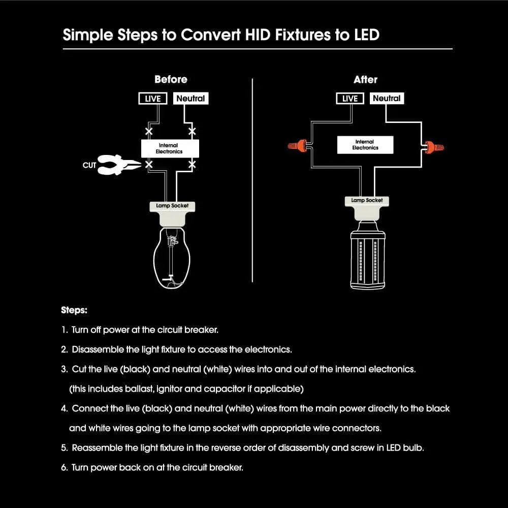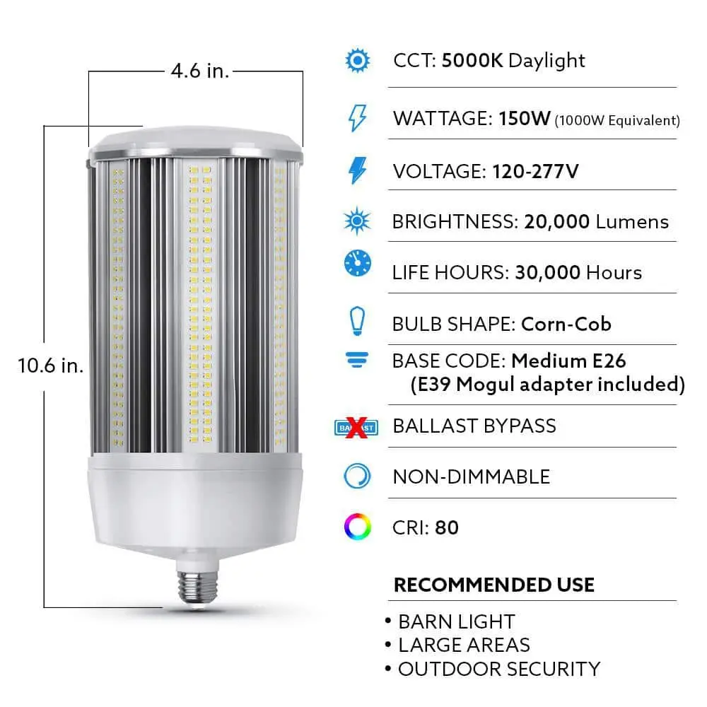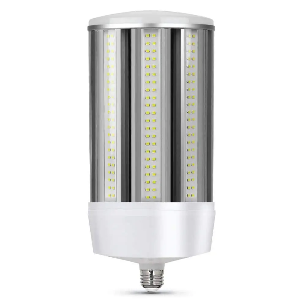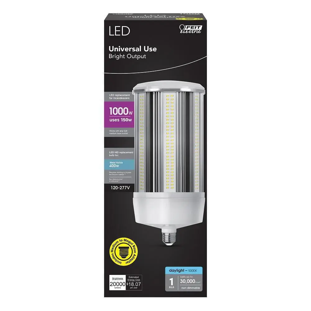 The C20000/5K/LED/HDRP corn cob-shaped LED light bulb from Feit Electric provides powerful illumination for large rooms, barns, or any area requiring bright light. Featuring an E26 (medium) base and an included E26 to E39 (mogul) base adapter, this bulb easily upgrades HID non-ballast fixtures to LED. With ultra-efficient LED technology, it emits 20,000 Lumens while consuming only 150 watts—up to 85% less energy than the equivalent 1,000-watt incandescent bulb. This bulb has an impressive lifespan of 30,000 hours (27.4 years) and is 100% mercury-free and ROHS compliant. It operates within a 120-277 volt range and can replace up to a 400W Metal Halide HID bulb. LEDs don’t require ballast, so installation is quick, and you’ll enjoy instant brightness and energy savings.