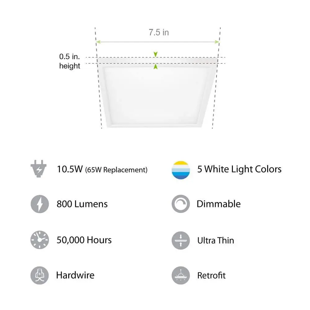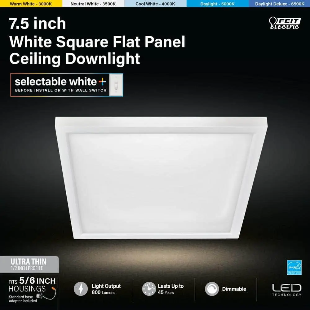 The Feit Electric 74208/6WYCA 7.5-inch Square LED Flat Panel combines functionality and style for any residential or commercial space. Its innovative selectable color temperature feature allows you to choose from Warm White, Neutral White, Cool White, Daylight White, or Daylight Deluxe White (3000K/3500K/4000K/5000K/6500K), either on the fixture itself or by toggling a wall switch after installation. With an ultra-slim, low-profile design (under 1 inch), this fixture provides uniform light distribution using edge-lit LEDs, eliminating hot spots, flickers, or glare. Perfect for kitchens, bathrooms, bedrooms, hallways, and more, it can be flush-mounted or installed in recessed cans (fits most 5" and 6" housings) with the included standard base adapter. The frosted polycarbonate lens and white aluminum frame enhance the modern aesthetic, while the 90+ CRI ensures vibrant, true-to-life colors. This fixture complies with California Title 24 and Energy Star standards, delivering 800 lumens of light using only 10.5 watts, saving up to 83.8% in energy costs compared to traditional incandescent lights. It has a 50,000-hour lifespan (45.7 years at 3 hours per day) and an estimated annual energy cost of just $1.26/year.