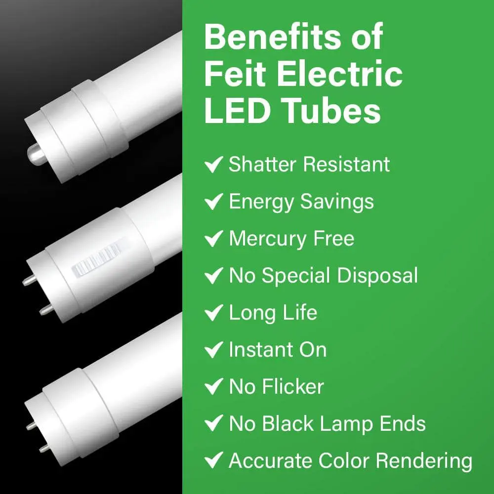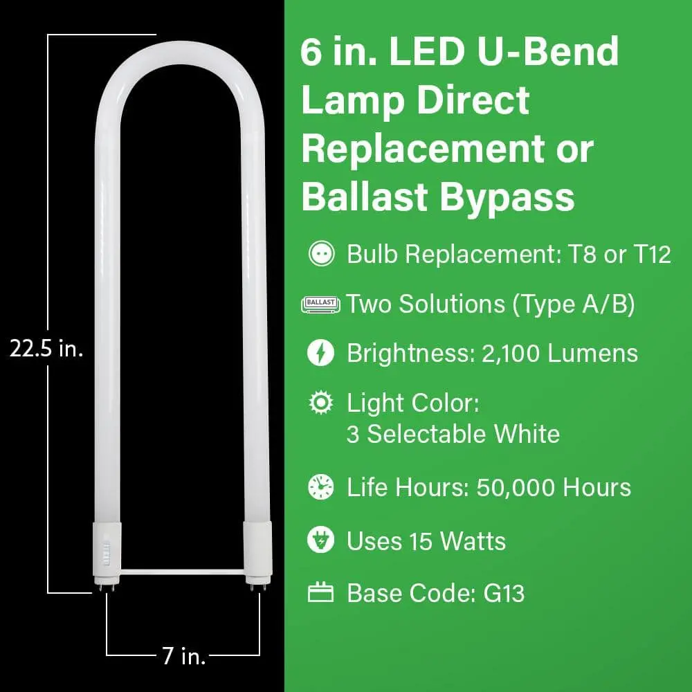 The Feit Electric 15-Watt (32-Watt equivalent) Selectable White Direct Replacement or Ballast Bypass (Type AB) Non-Dimmable U-Bend LED Lamp replaces FB32T8/U fluorescent and LED tubes. This versatile lamp can be installed as a direct replacement for T8 U-Bend fluorescent tubes with the existing electronic ballast or by rewiring the fixture to bypass the ballast. It provides 2100 Lumens of light output while using 53.1% less energy than traditional fluorescent bulbs. The selectable color temperature feature allows you to choose from 3000K (Warm White), 4000K (Cool White), or 6500K (Daylight White) before installation. Ideal for both residential and commercial use, this LED tube is perfect for spaces like garages, offices, warehouses, and more. It offers high color rendering for vibrant, true-to-life colors and flicker-free, instant-on lighting. With up to 50,000 hours of life, this LED tube is shatter-resistant, mercury-free, and easy to dispose of.