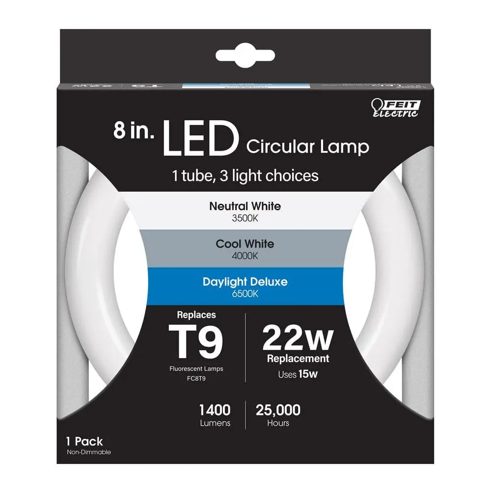 Upgrade your fluorescent fixtures with the Feit Electric 15W (22W Equivalent) 8-Inch Circline LED Light, designed to deliver energy-efficient, high-quality illumination. This non-dimmable LED tube provides 1400 lumens of brightness and serves as a direct replacement for FC8T9 or T9 fluorescent bulbs—ideal for ceiling fans and other fixture applications. Choose from 3500K Neutral White, 4000K Cool White, or 6500K Daylight before installation to achieve the perfect lighting for any setting.