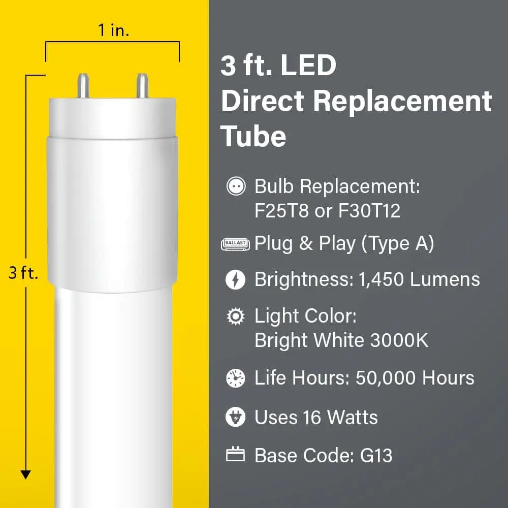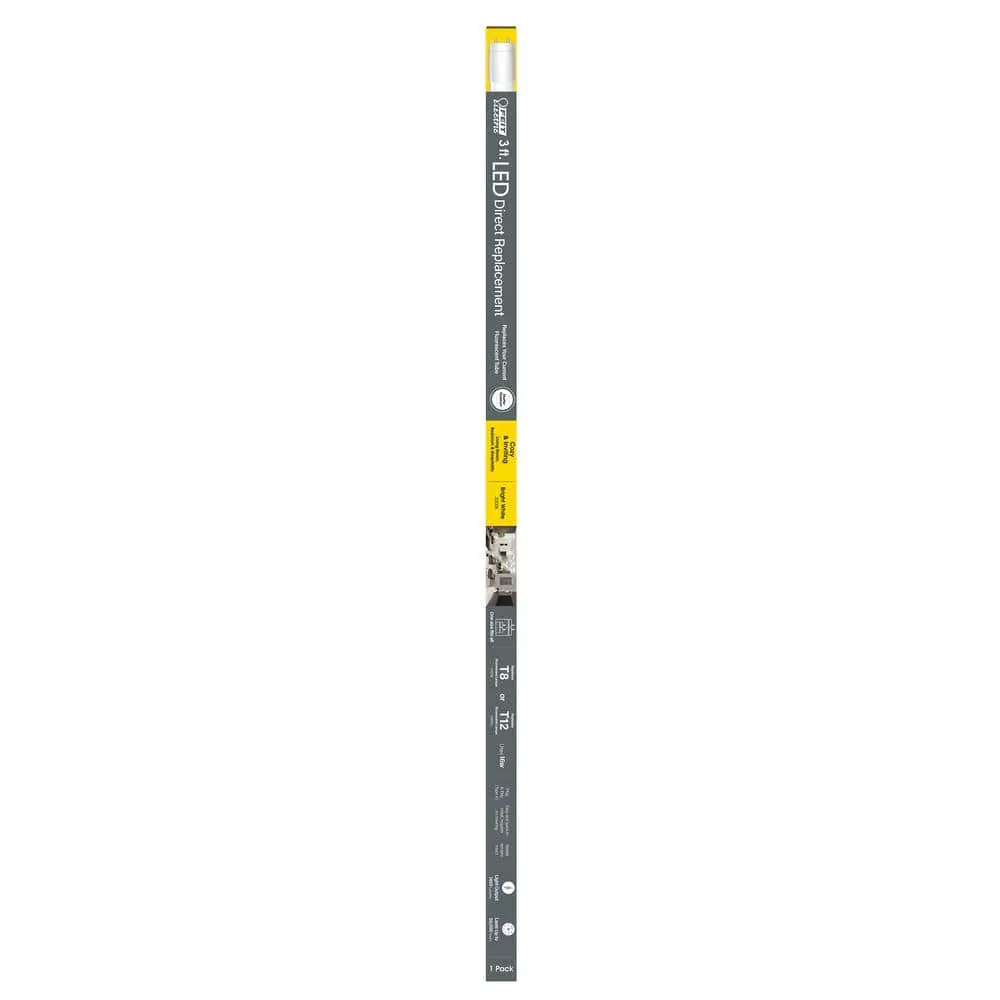Feit Electric's 16-Watt (25/30-Watt Equivalent) Direct Replacement (Type A) Non-Dimmable Linear LED Tubes are designed to replace F17T8 or T8 and F20T12 or T12 fluorescent and LED tubes. They offer quick and easy installation without the need for rewiring, as they work with most existing ballasts. These LED tubes produce 1,450 Lumens while consuming less energy than traditional fluorescent tubes. The 3000K Bright White light creates a warm, welcoming ambiance in both residential and commercial settings, perfect for bedrooms, living rooms, restaurants, and hotel lobbies. These lights offer up to 36% energy savings and reduced maintenance costs compared to standard fluorescent lights. The T36/830/LEDG2/RP lights provide flicker-free, instant-on illumination without any warmup time. They are mercury-free, shatter-resistant, and safe for easy disposal. With accurate color rendering, they bring out vibrant, true-to-life colors. The low heat emission extends the bulb's lifespan, and the tube ends remain intact without burning or blackening. The estimated annual energy cost is only $1.93. Switch to Type A LED linear lights for an impressive 50,000-hour lifespan, which is equivalent to 45.7 years based on 3 hours of daily use.