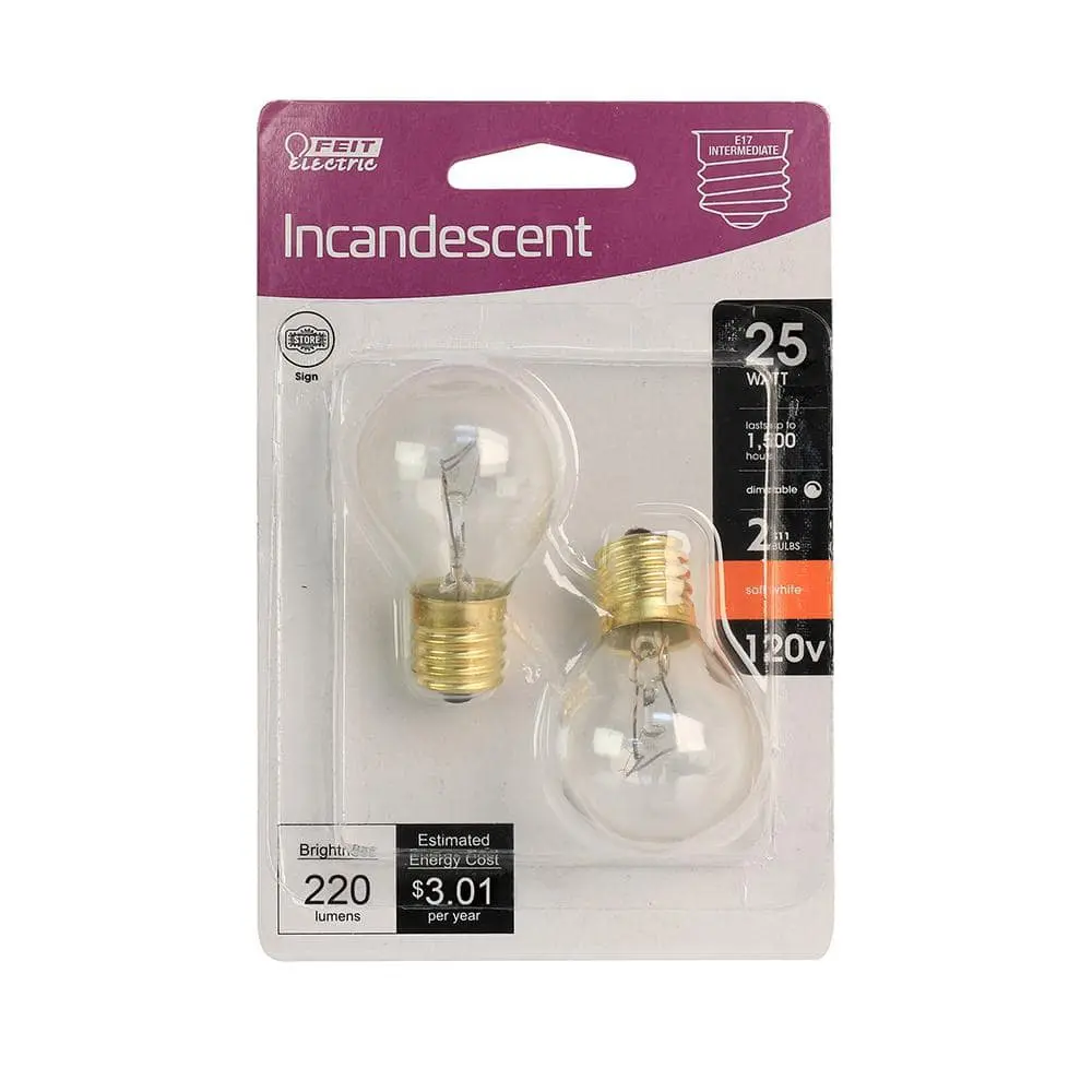 Enjoy peace of mind with the Feit Electric 25-Watt S11 Soft White Incandescent Light Bulb. The BP25S11N/2/HDRP bulb offers a 2700K soft white glow while consuming just 25 watts of energy. This fully dimmable bulb features an intermediate E17 base and provides up to 1,500 hours of use, making it a reliable lighting solution for your space.