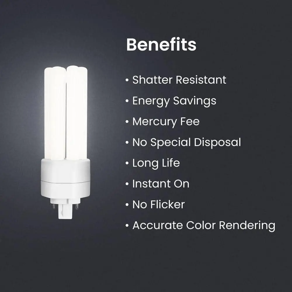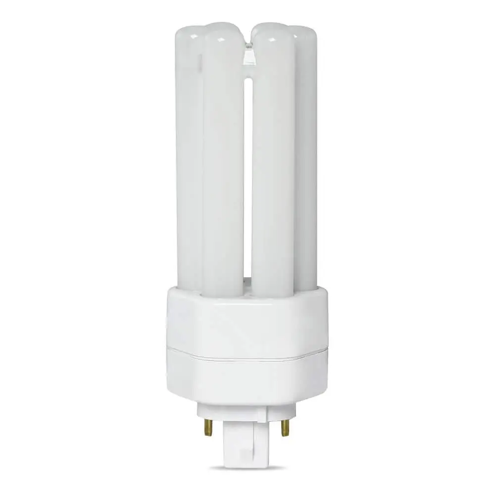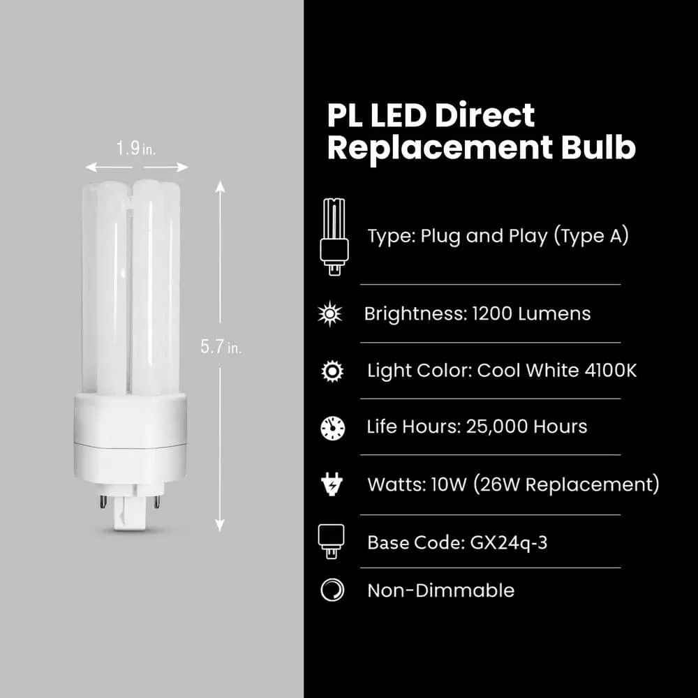 Upgrade your lighting with the Feit Electric BPPLT26E841LEDG2HDRP GX24Q-3 Base LED Triple Tube Replacement Bulb, designed to replace PL Shape Lighting Fixtures. This plug-and-play solution is an easy replacement for 4-pin bulbs. It offers 1200 lumens of Cool White (4100K) light while consuming just 10 watts of energy, providing the same brightness as traditional 26-watt bulbs. This LED bulb uses up to 61% less energy than standard fluorescent bulbs. Installation is simple, with no need to replace the ballast or install an LED driver. Feit Electric PL lamps are RoHS compliant and 100% mercury-free. Enjoy instant full brightness with minimal heat output. Ideal for general-purpose and task lighting, this bulb offers a long average lifespan of 25,000 hours (22.8 years). The estimated yearly energy cost is only $1.20, making it an excellent choice for residential or commercial use.