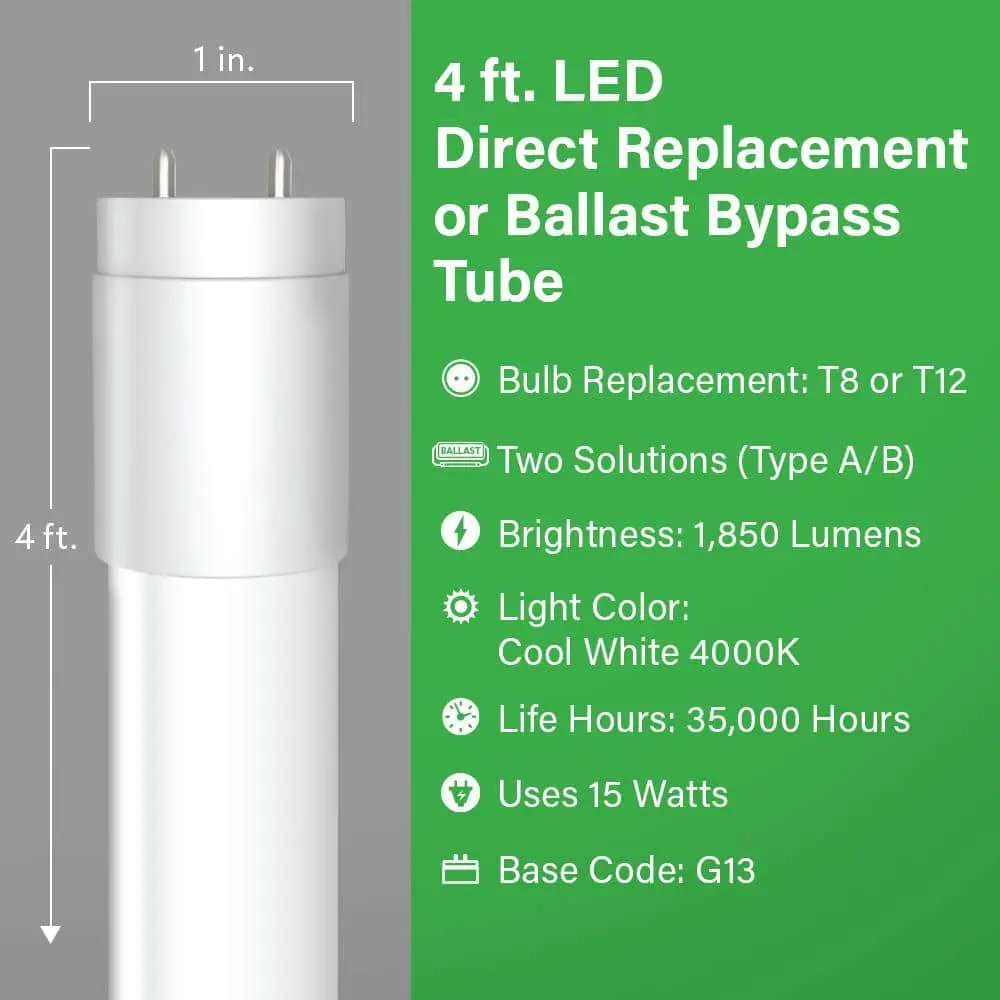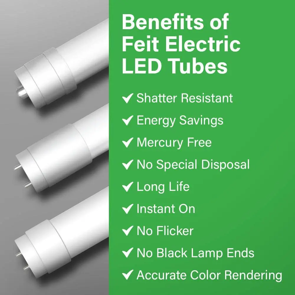Upgrade your lighting with Feit Electric’s 15W (32W equivalent) Selectable White LED Tube, designed for both direct replacement (Type A) and ballast bypass installation (Type B). Easily install these versatile tubes by either plugging them into existing electronic ballasts—no rewiring needed—or bypassing the ballast for improved efficiency and reduced maintenance. Emitting 1,850 lumens, these energy-saving LED lights provide crisp, neutral 4000K Cool White illumination while using up to 53.1% less energy than traditional fluorescent bulbs. Ideal for offices, garages, warehouses, and workspaces, these high-CRI LED tubes deliver flicker-free, instant-on brightness with no warm-up time. Plus, they are shatter-resistant and mercury-free for safe disposal. With a lifespan of up to 50,000 hours (45.7 years based on 3 hours/day), they are a long-lasting, cost-effective lighting solution.
