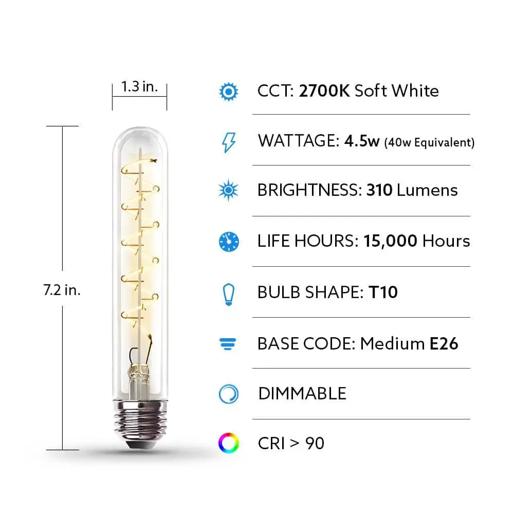 Feit Electric’s soft white dimmable 40-Watt Vintage-Style LED T10L light bulbs combine timeless charm with modern LED technology. Featuring a spiral-shaped filament, this decorative bulb emits a warm 2700K light, perfect for creating a vintage atmosphere. Ideal for use in exposed fixtures like dining room chandeliers, kitchen tables, or bars, it adds a cozy, retro vibe to any space. The 350-lumen output creates a nostalgic glow, transforming any room, from kitchens and living rooms to bedrooms, restaurants, and bars. This LED filament bulb fits standard medium E26 bases and offers energy-efficient, reliable lighting with full dimming capabilities. Enjoy customizable vintage lighting with Feit Electric’s decorative LED Edison bulbs, suitable for both residential and commercial settings.