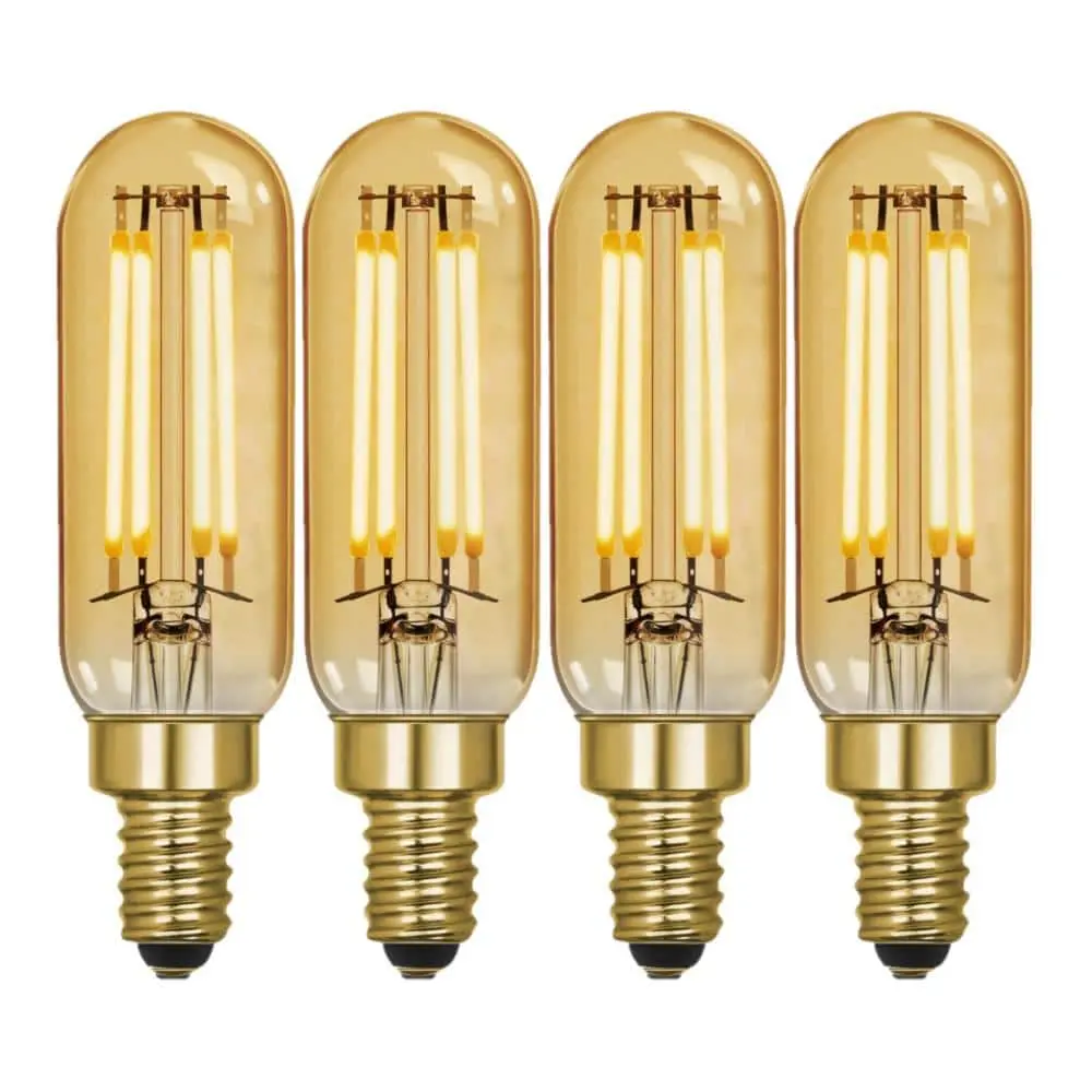 Feit Electric's warm white dimmable 40-Watt equivalent T6 Edison vintage LED bulb blends classic aesthetics with modern energy efficiency and reliability. Designed with an intricate straight LED filament, this decorative bulb emits a cozy 2100K glow, perfect for creating a nostalgic ambiance. Its amber glass housing enhances the vintage appeal, making it ideal for exposed fixtures in dining areas, bedrooms, kitchens, bars, and more. Whether used in chandeliers, pendant lights, or as a statement piece, this energy-saving LED bulb offers full dimming capabilities for customizable lighting in any space. Compatible with standard E12 candelabra base fixtures, it provides long-lasting performance for both residential and commercial use.
