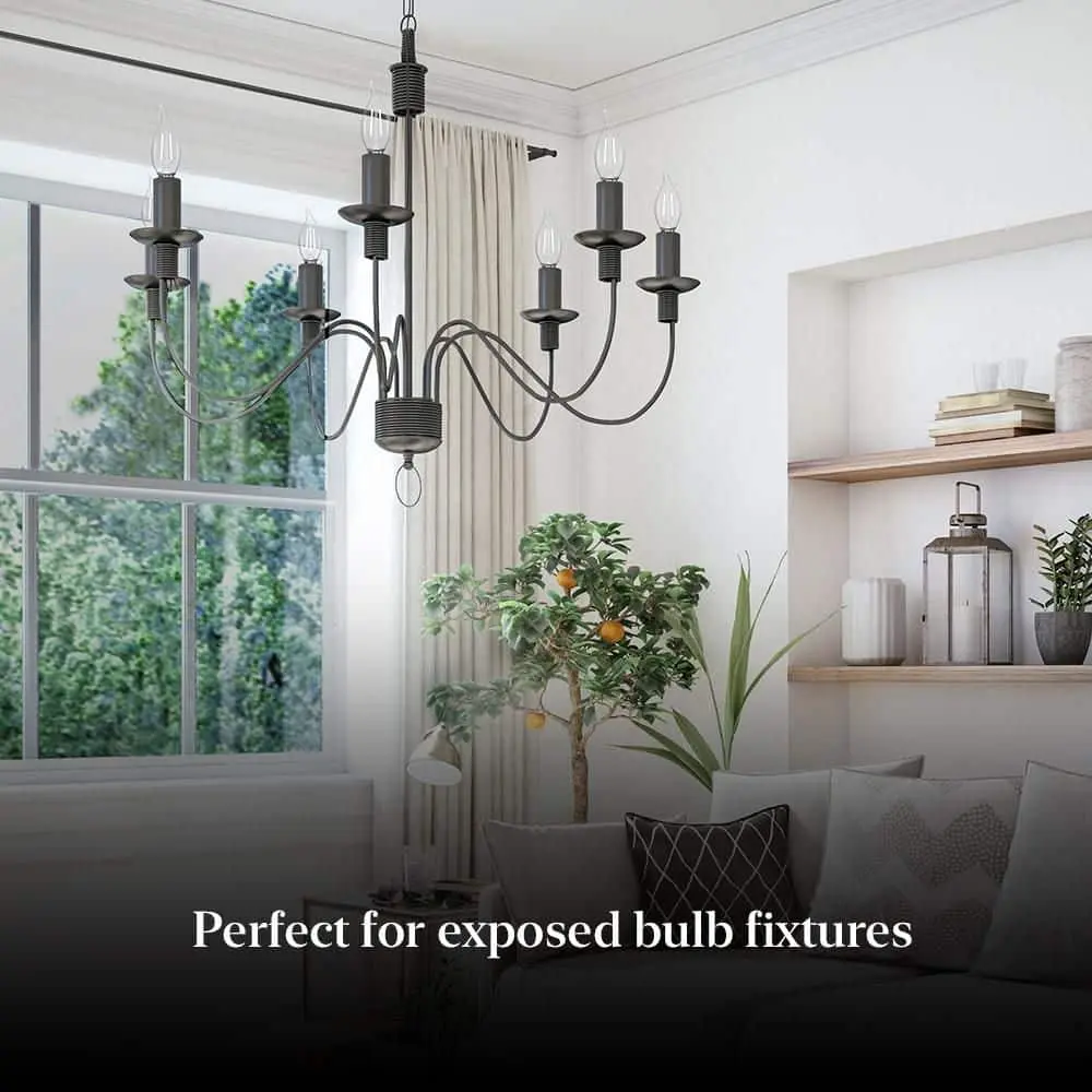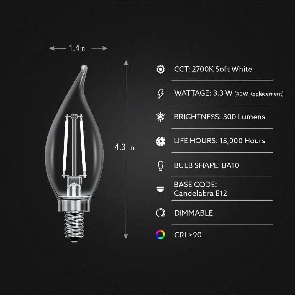 Transform your lighting with Feit Electric's stylish Exposed White Filament Flame BA10 LED Bulbs, offering a modern twist on traditional decorative bulbs. These innovative white filament bulbs combine a classic flame tip design with sleek, lower-profile white filaments inside clear glass. Unlike yellow filaments, the white filaments seamlessly blend into your decor, providing a timeless look that complements any room. The dimmable 2700K Soft White glow creates a relaxing and inviting atmosphere, free of harsh glare. Ideal for any fixture with a Candelabra E12 base, such as chandeliers, wall sconces, and coach lanterns, these bulbs emit 300 lumens of light while consuming just 3.3 watts, delivering up to 91.8% energy savings compared to standard 40-watt incandescent bulbs. A 90+ CRI ensures more vibrant and natural colors. With a lifespan of up to 15,000 hours and an estimated energy cost of only $0.40 per year, these bulbs are a great way to enhance both home and commercial spaces.