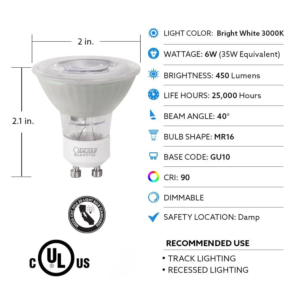 The Feit Electric 50-Watt Equivalent MR16 LED Flood Light Bulb is a high-performance, energy-efficient lighting solution perfect for track and recessed lighting. Featuring a GU10 twist-lock base, this bulb delivers 450 lumens of 3000K Bright White light, creating a cool, energizing ambiance while consuming just 6 watts—up to 88% less energy than a traditional 50W incandescent bulb.