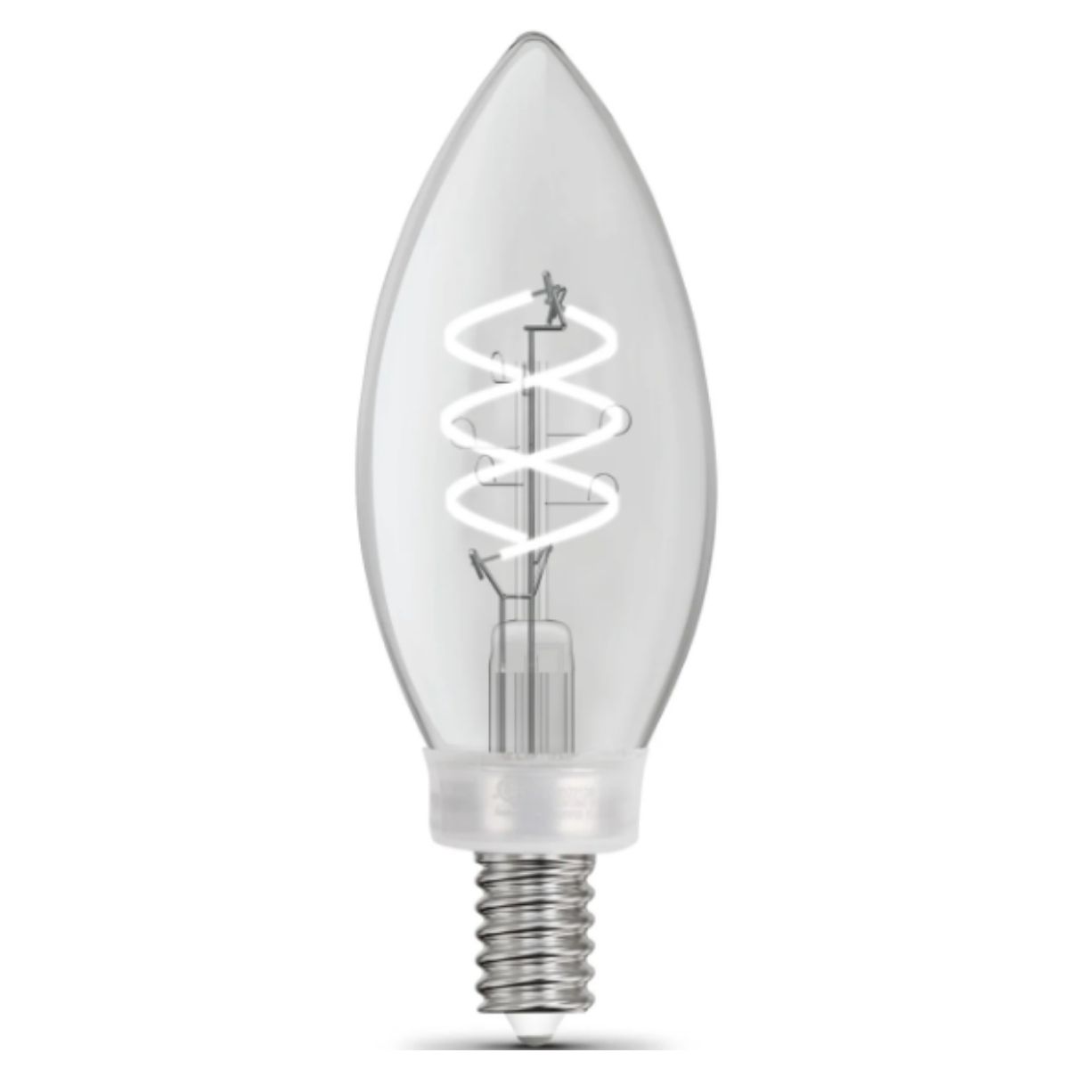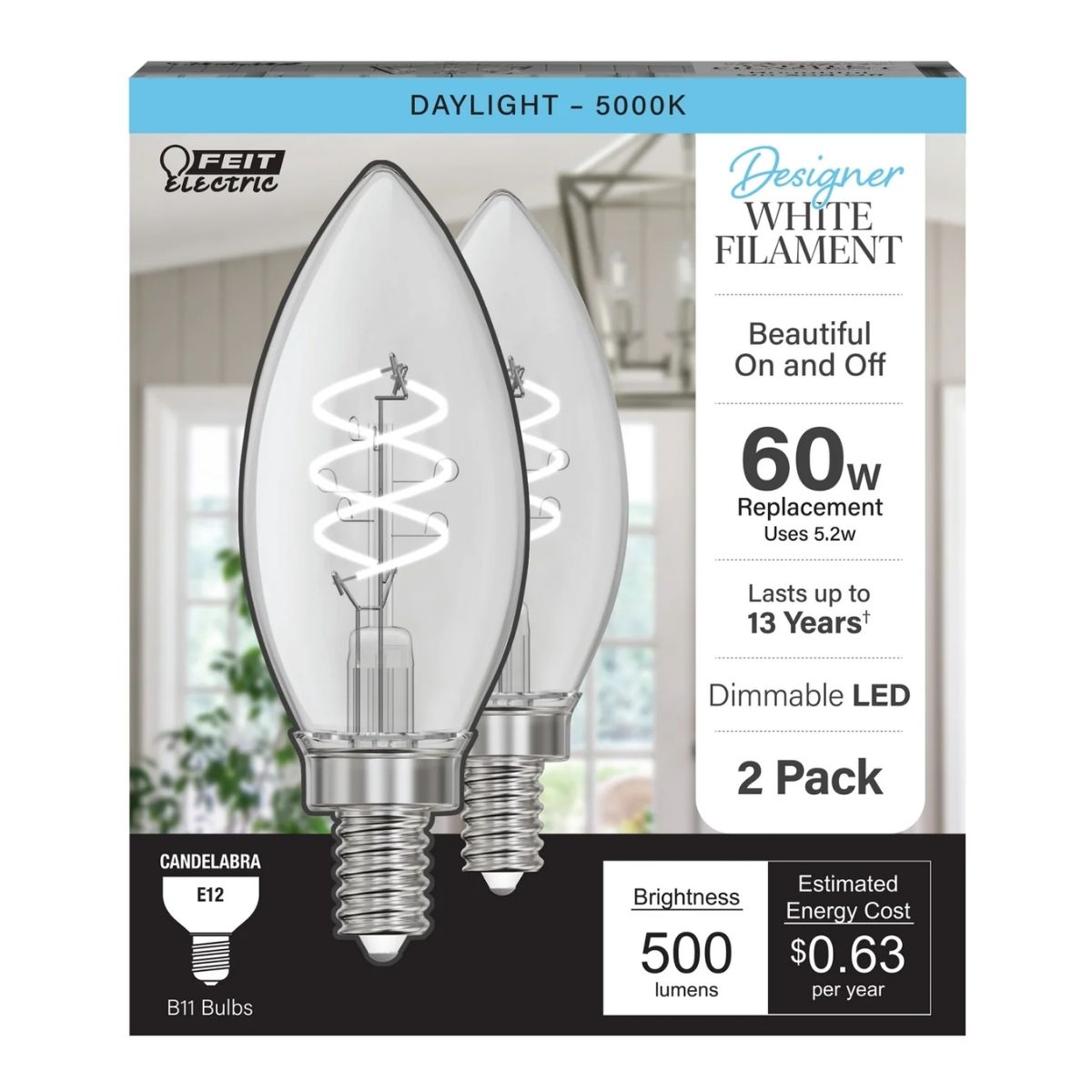 Upgrade your lighting to Feit Electric’s elegant Designer White Filament LED Light Bulbs for a fresh take on decorative bulbs. These first-of-their-kind white filament bulbs take a traditional torpedo tip bulb with exposed filament encased in clear glass and add lower-profile double spiral white filaments. Unlike yellow filaments, these blend into your current décor, for a timeless look that complements any room. They give off a dimmable 5000K Daylight White glow ideal light for craft rooms, bathrooms, kitchens, laundry rooms, utility rooms, and anywhere you desire invigorating light.