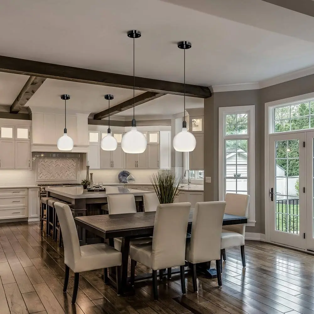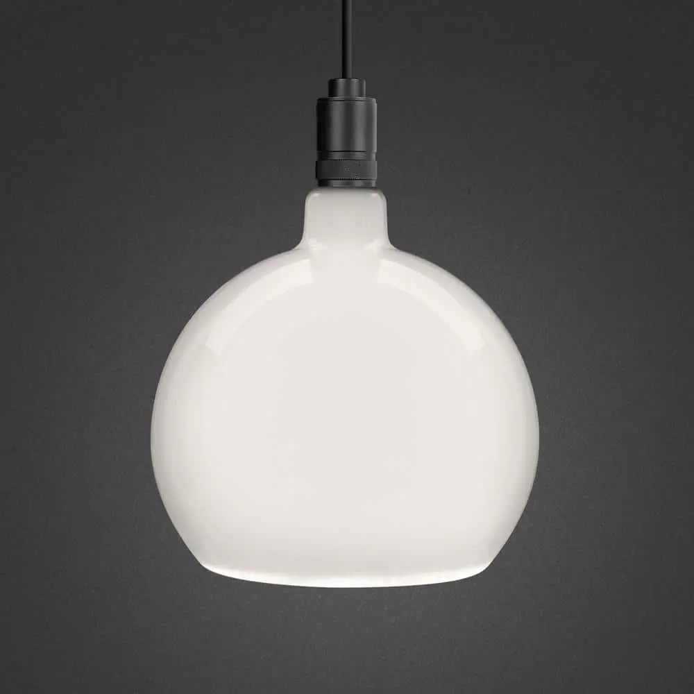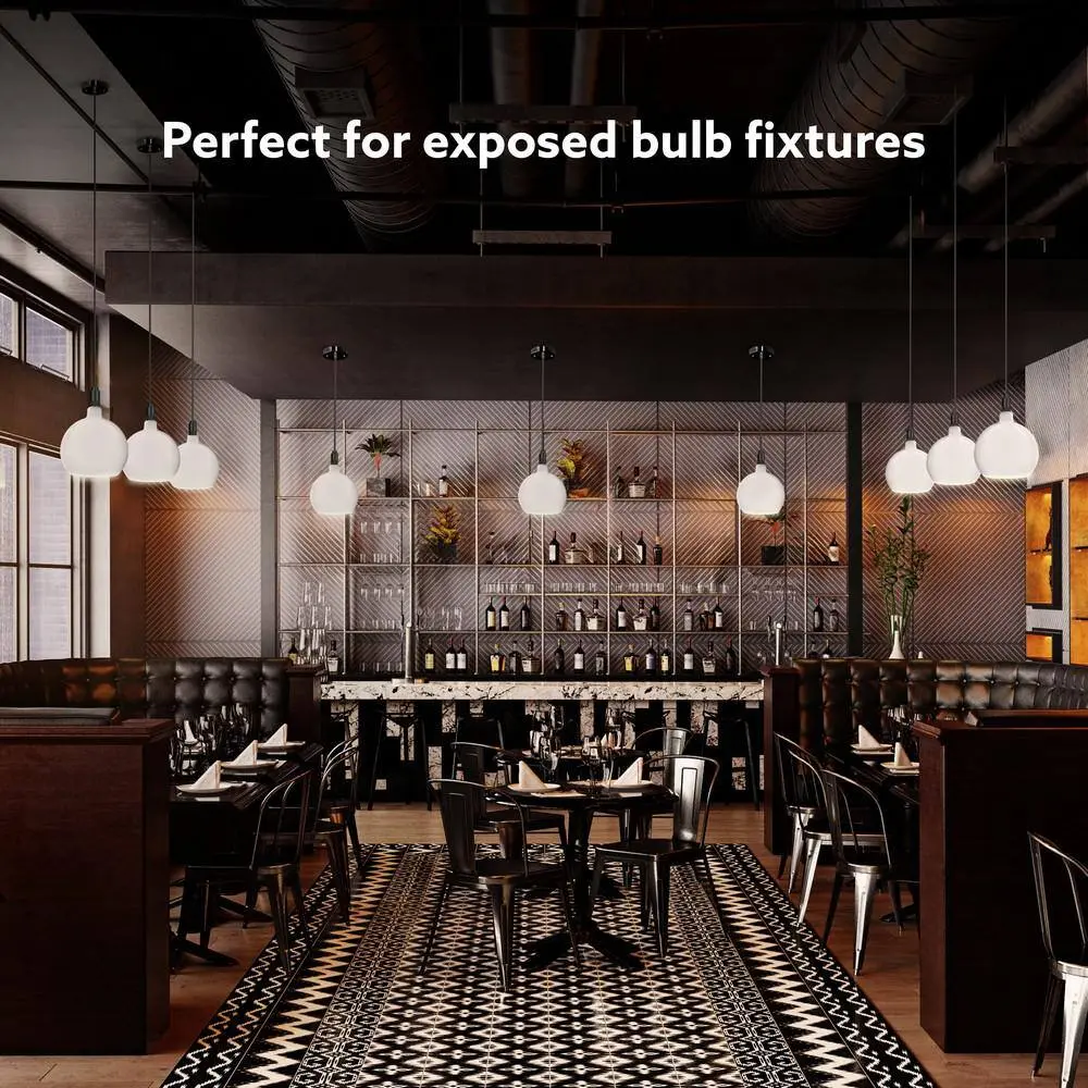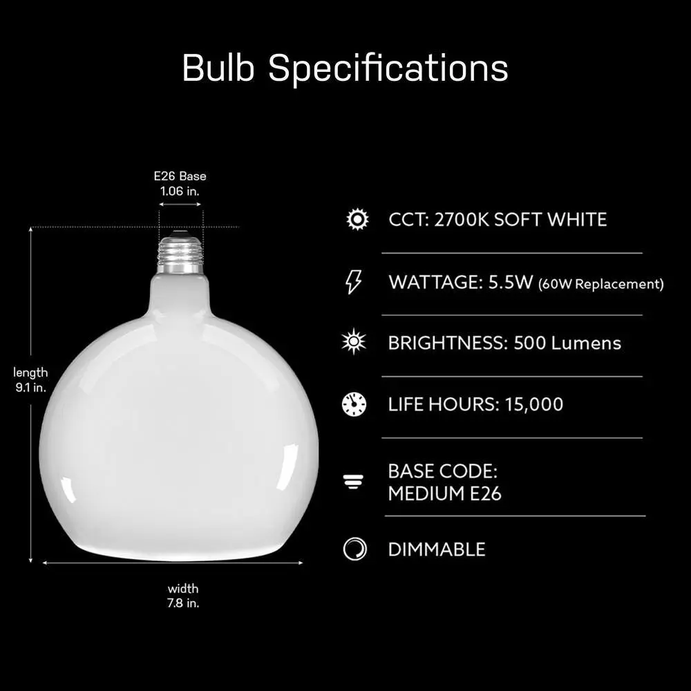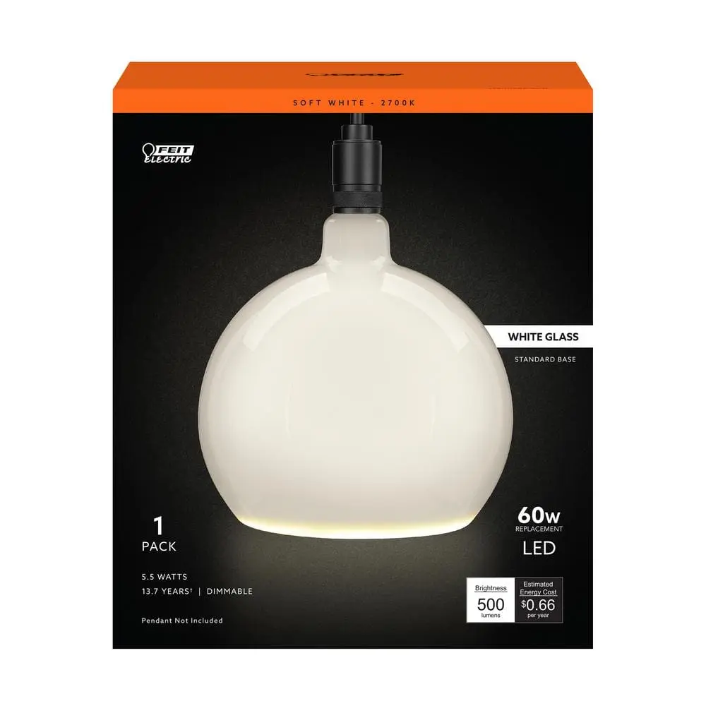 Add a touch of luxury and style to your home with the Frosted Globe LED Bulbs from Feit Electric. This sculptural glass sphere features a sleek, geometric design that will surely catch the eye. Its elegant, understated shape and intricate details make it the perfect addition to any room. Discreet LED strips along the bottom edge evenly distribute soft light, while the opaque glow creates a mid-century modern feel that suits residential spaces, hotels, and luxury retail environments. The Soft White 2700K color temperature provides a warm, welcoming ambiance ideal for living rooms, dining areas, and bedrooms. Benefit from energy savings with LED technology as each bulb produces 500 lumens using just 5.5W of power. This versatile bulb fits into medium E26 sockets and can be used in pendant lights or wall sconces to give a fresh update to traditional fixtures. Paired with Feit Electric woven fabric pendants (sold separately), it creates a premium, modern look. The integrated LEDs last up to 15,000 hours, providing up to 13.7 years of beautiful light.
