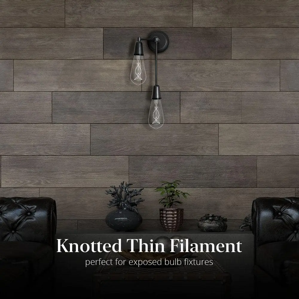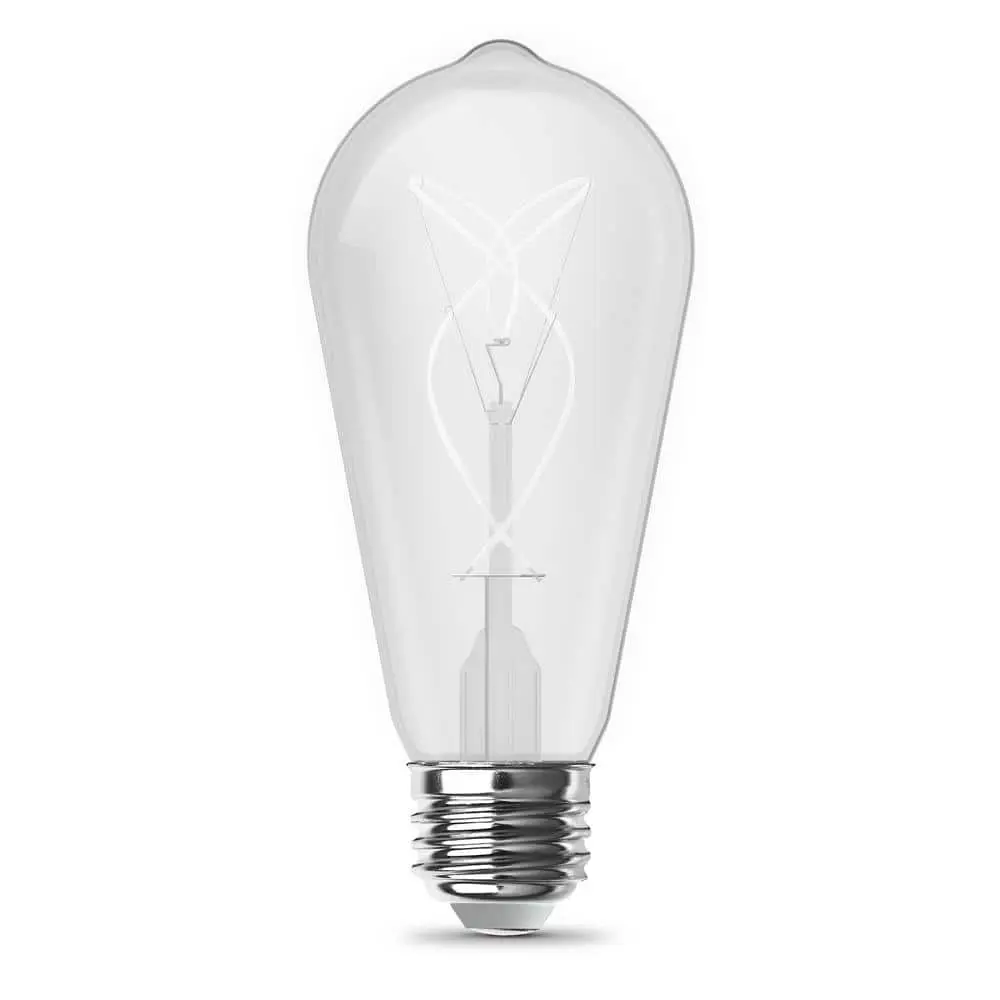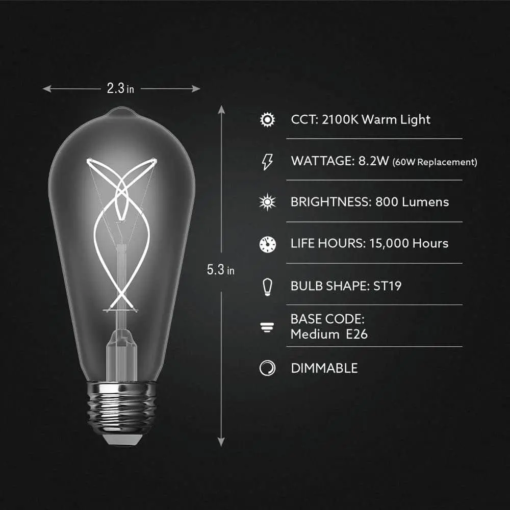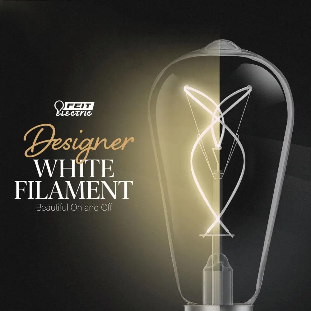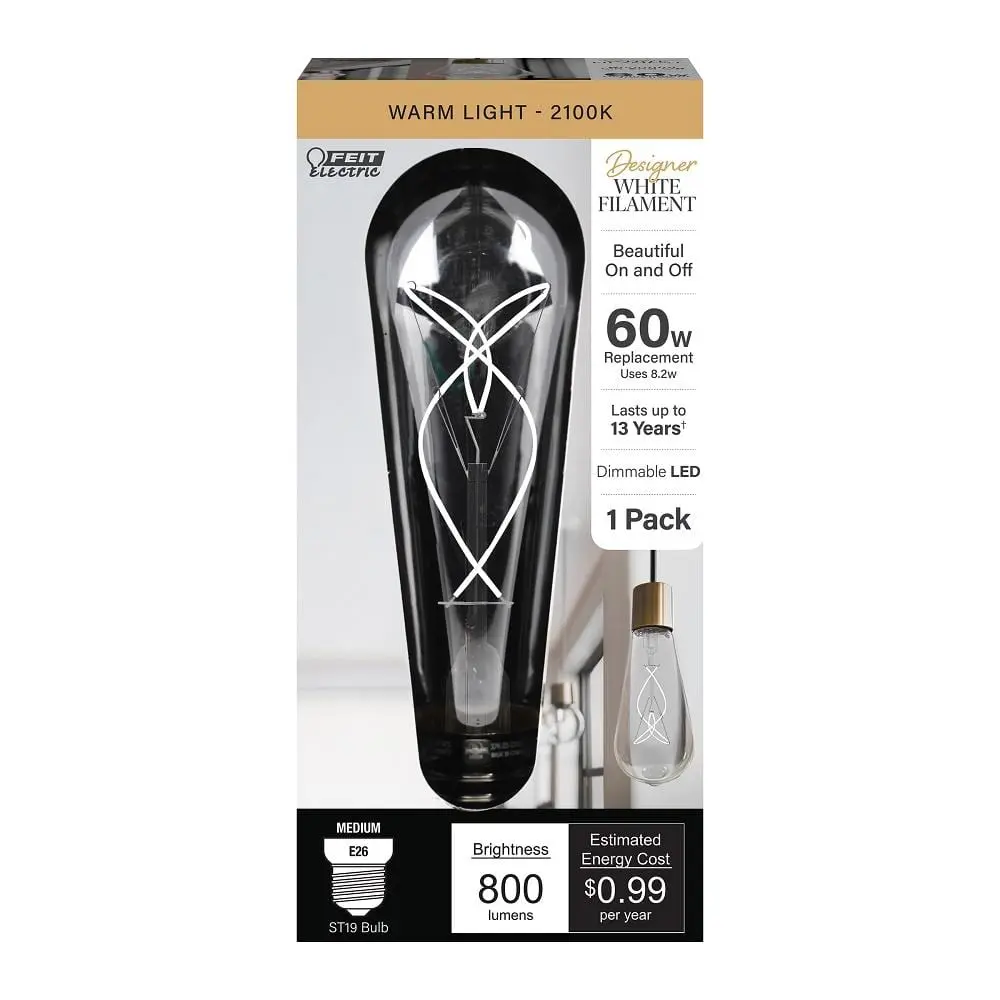 Enhance your lighting with Feit Electric's Designer White Filament LED Light Bulbs, offering a fresh twist on decorative lighting. These innovative white filament bulbs feature a traditional ST19 shape with exposed filaments encased in clear glass, and are enhanced with sleek, low-profile white filaments. Unlike yellow filaments, they seamlessly blend into your existing decor for a timeless look. The dimmable 2100K Warm White glow creates a relaxing and inviting ambiance without any harsh glare. These bulbs fit into any medium E26 base, making them perfect for wall sconces, pendant lights, and table lamps. The ST1960S3821WFIL/HDRP emits 800 lumens while consuming only 8.2 watts, providing up to 86.3% energy savings compared to a 60-watt incandescent bulb. With a lifespan of up to 15,000 hours, it offers an estimated energy cost of $0.99 per year. Add style and efficiency to your home or business space.