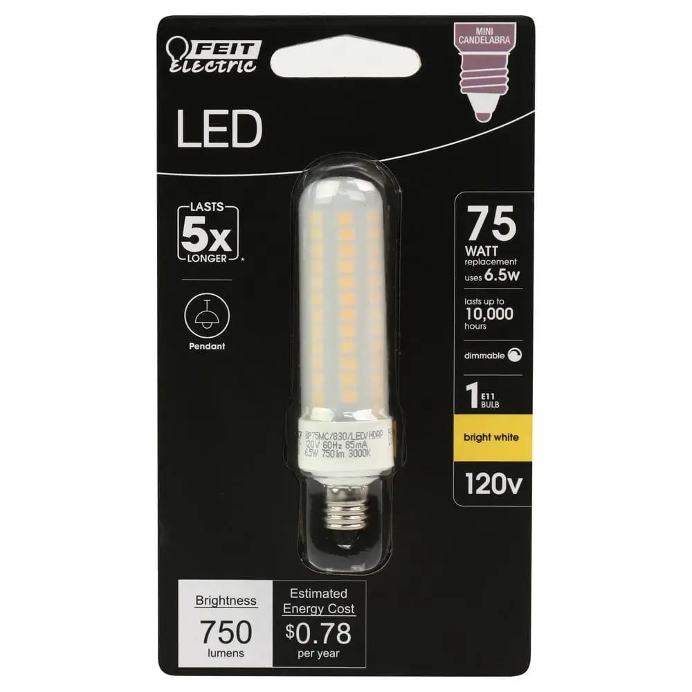 Experience the benefits of advanced LED energy-saving technology with the Feit Electric BP75MC/830/LED/HDRP 6.5-Watt T4 Specialty LED Light Bulb. Designed to replace a 75-watt incandescent bulb, it delivers 800 lumens of bright white (3000K) light while using significantly less energy—up to 90% less than standard incandescent bulbs. This dimmable LED bulb provides instant full brightness with a cool operating temperature. With an average lifespan of 10,000 hours, it is RoHS compliant and completely mercury-free, making it a reliable choice for residential and commercial refrigerator and indicator lighting.