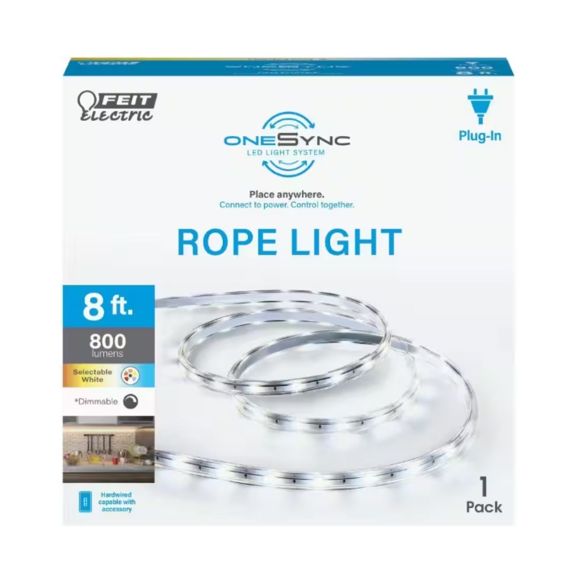 The Feit Electric 8-Foot OneSync UCL96/ROPE/5CCTG2 color selectable Under Cabinet LED Rope Light is the perfect solution for your under cabinet lighting needs. With its all-in-1 design, this kit is ready to go right out of the box. It offers the convenience of being dimmable with most AC switches, allowing you to adjust the brightness to your liking. The 3M brand adhesive backing ensures a simple and fast installation process