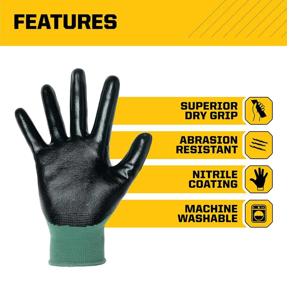 Nitrile coated gloves provide outstanding performance across a wide range of tasks and industries. Lightweight and snug, they offer excellent dexterity, fitting like a second skin. The nitrile coating on the palms and fingers enhances grip, offering control while protecting against liquids, adhesives, greases, oils, and epoxies. Designed with a breathable knit back for all-day comfort, these gloves ensure natural movement, reduce hand fatigue, and are latex-free, making them safe for those with latex allergies.