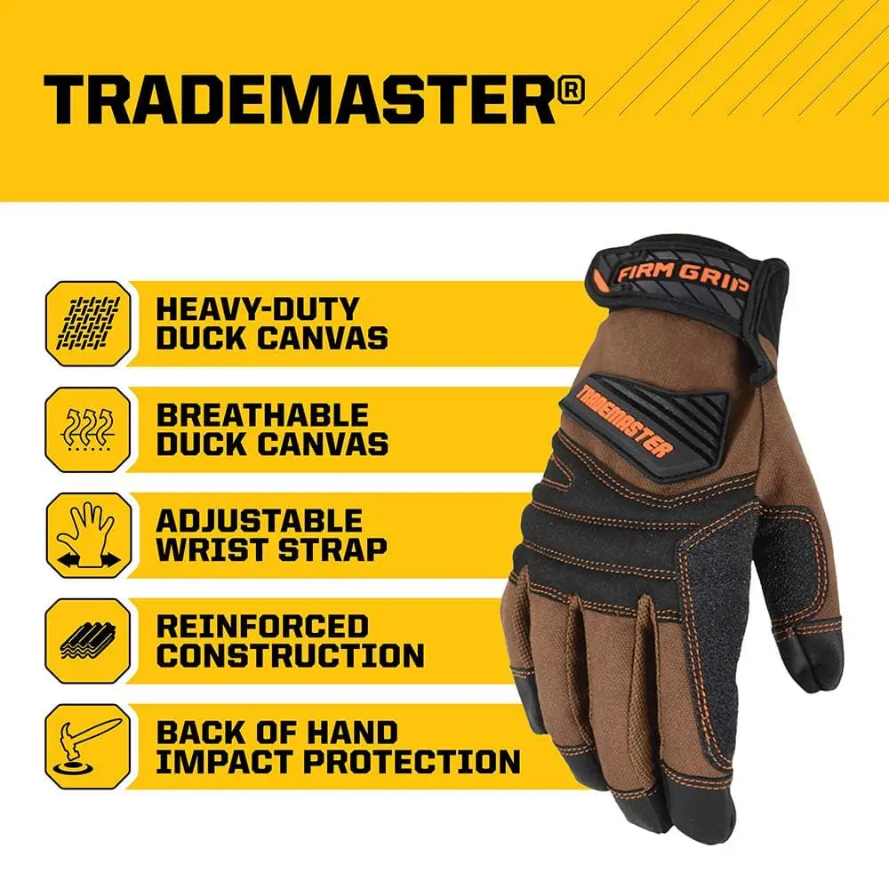 The TradeMaster gloves are built to handle tough jobs with ease. Made from heavy-duty, breathable duck canvas, they quickly conform to your hands for a comfortable fit. The quick-drying canvas material resists stiffening in wet conditions, while padded knuckles and textured synthetic leather palms provide superior impact and abrasion protection. An adjustable hook-and-loop strap ensures a secure, customized fit, and touchscreen compatibility allows convenient use of electronic devices without removing the gloves. Machine washable for extended use.