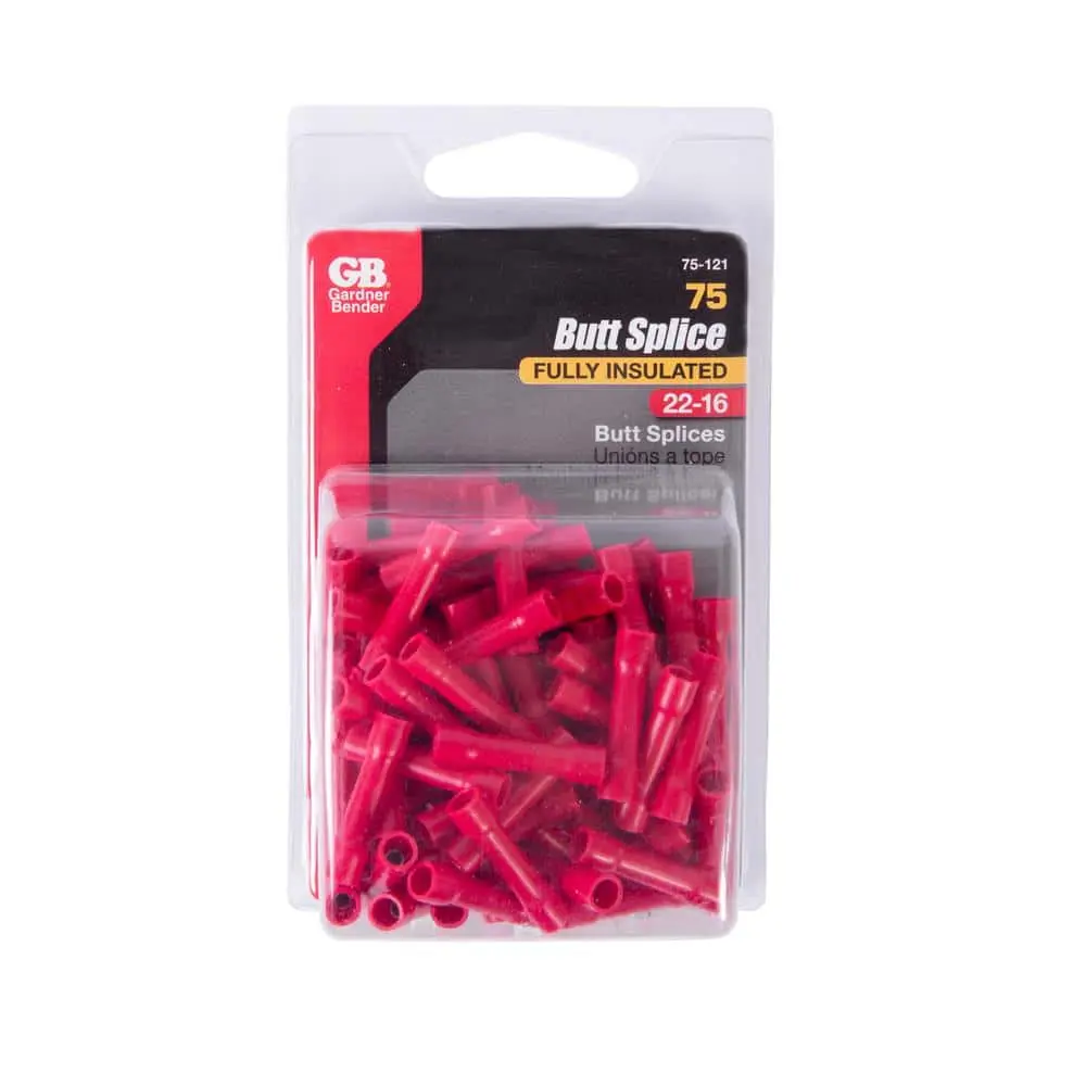 Gardner Bender terminals and wiring accessories provide reliable performance and versatility, meeting the high standards professionals require. With various packaging options available, Gardner Bender ensures secure wire connections for all your needs. The 22-16 AWG Red Butt Splice Wire Connectors (75-Pack) offer protection for spliced electrical wires, made from durable vinyl with temperature resistance up to 167°F.