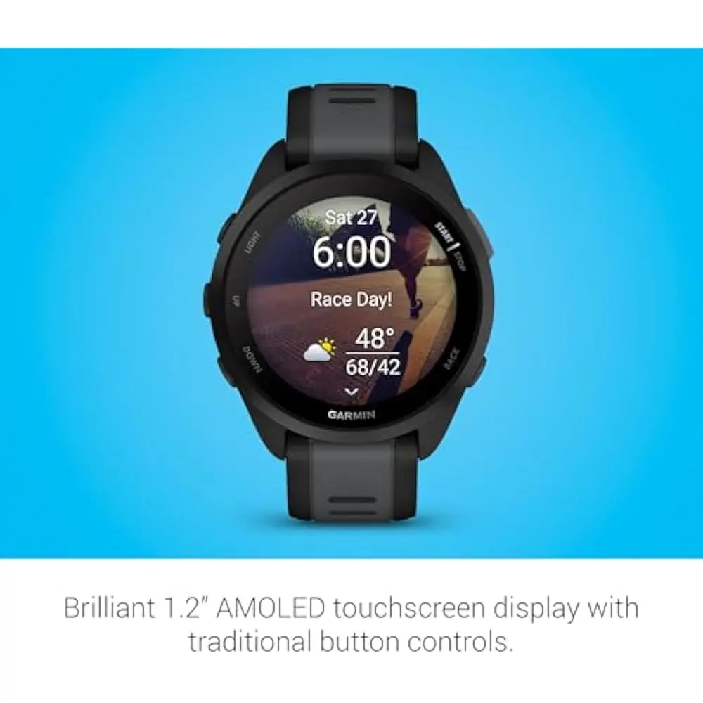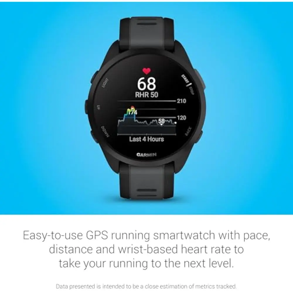 The Garmin Forerunner 165 (model number 010-02863-20, ASIN B0CT3SGHXL) is a lightweight GPS running smartwatch designed for performance and comfort. It measures 1.69 x 0.46 x 1.69 inches and weighs just 1.38 ounces. Featuring a 1.2" AMOLED touchscreen display, it includes built-in GPS, 4 GB of storage, and Bluetooth connectivity. Powered by a Lithium Polymer battery (included), the watch supports heart rate monitoring, training metrics, and recovery insights. Compatible with Android devices, it's ideal for fitness tracking and daily wear.