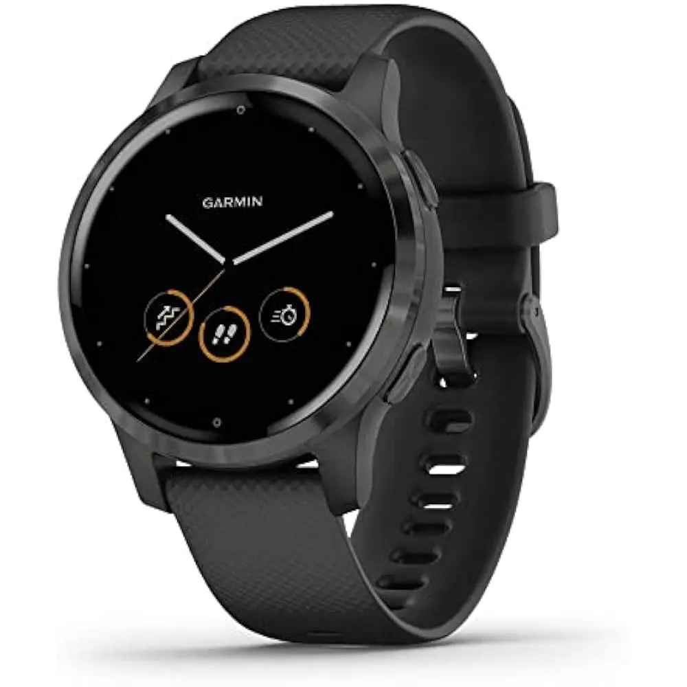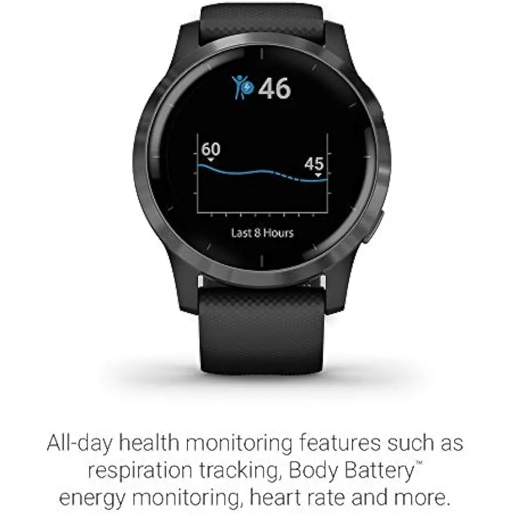 The Garmin Vivoactive 4 tracks everything from sleep to steps, keeping you on top of your health and fitness goals. Packed with advanced health monitoring features, this smartwatch includes a wrist-based heart rate monitor that tracks your effort during workouts and alerts you if your heart rate stays elevated while at rest. A pulse ox sensor measures your blood oxygen saturation to help assess how well your body absorbs oxygen, while stress tracking shows you if you're experiencing a calm, balanced, or stressful day. Advanced sleep monitoring tracks your light, deep, and REM sleep stages, and the Body Battery feature keeps tabs on your energy levels throughout the day to help you find the best times for both workouts and rest.