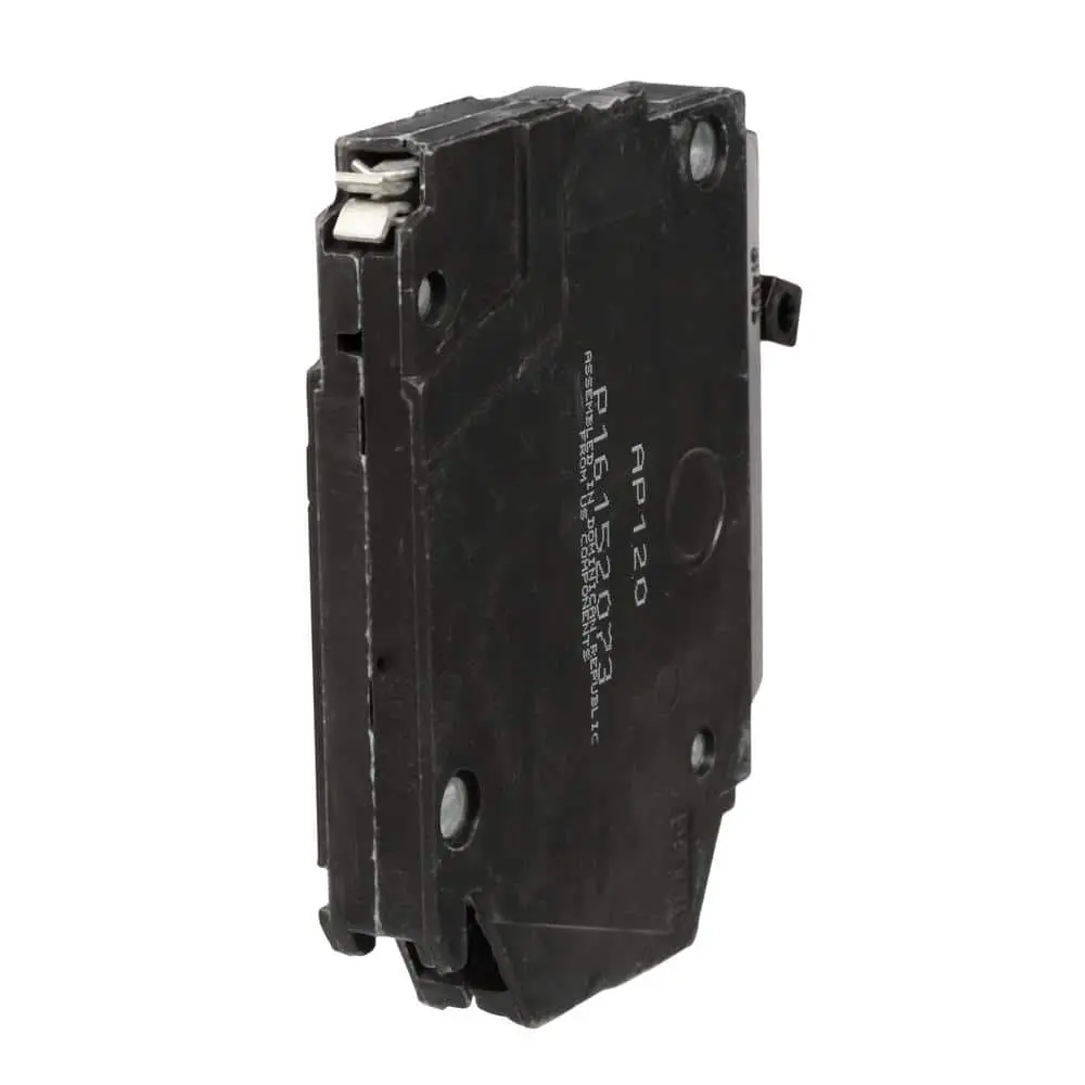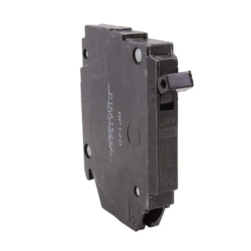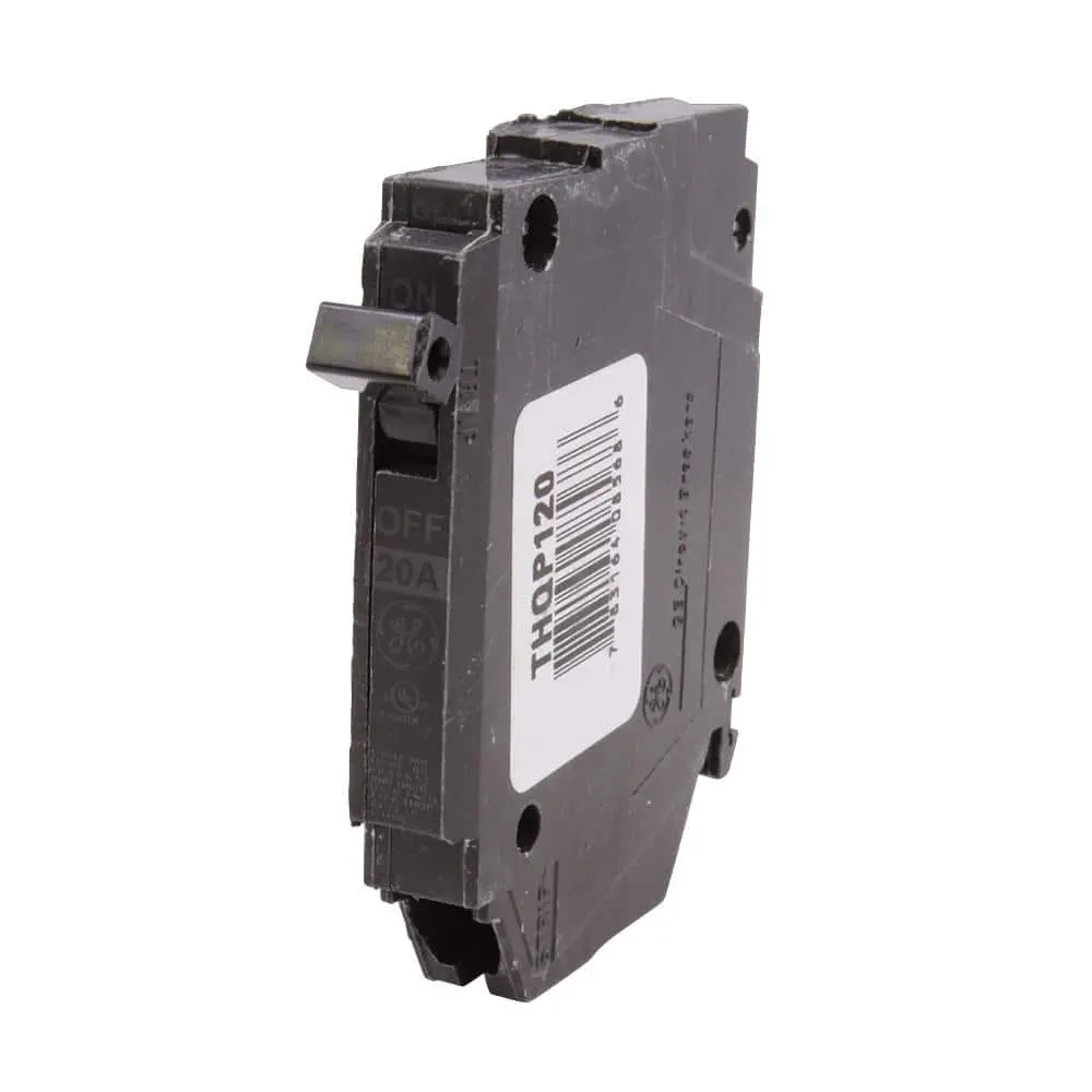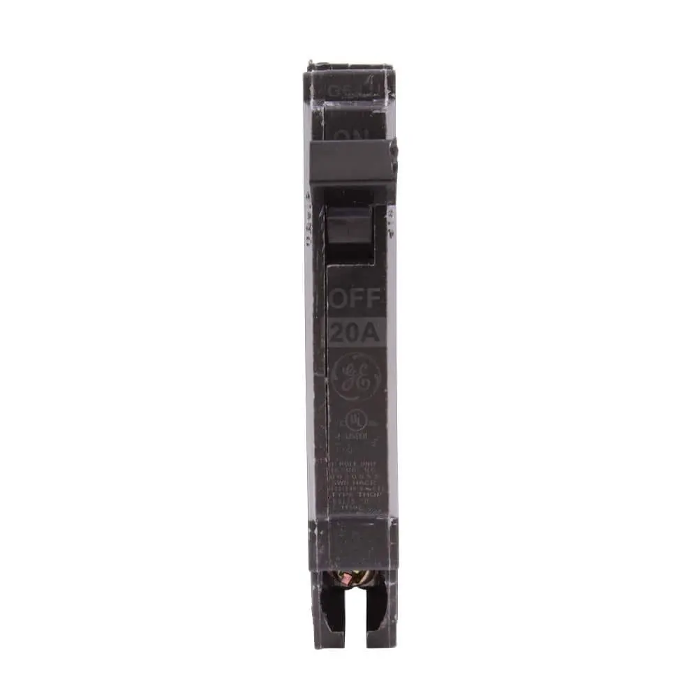 The GE Q-Line 20 Amp 1/2 in. Single-Pole Circuit Breaker is constructed with a heat-resistant thermoset case for enhanced stability and structural integrity. It features tin-plated copper stabs, providing a permanent, corrosion-resistant connection. The breaker includes a calibration screw that is securely cemented to prevent shifting, ensuring consistent and optimal performance.