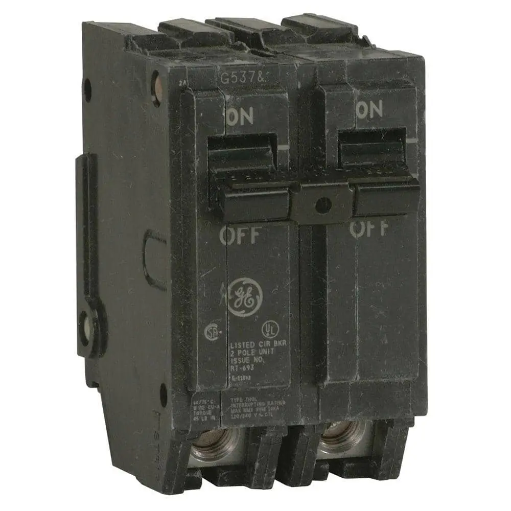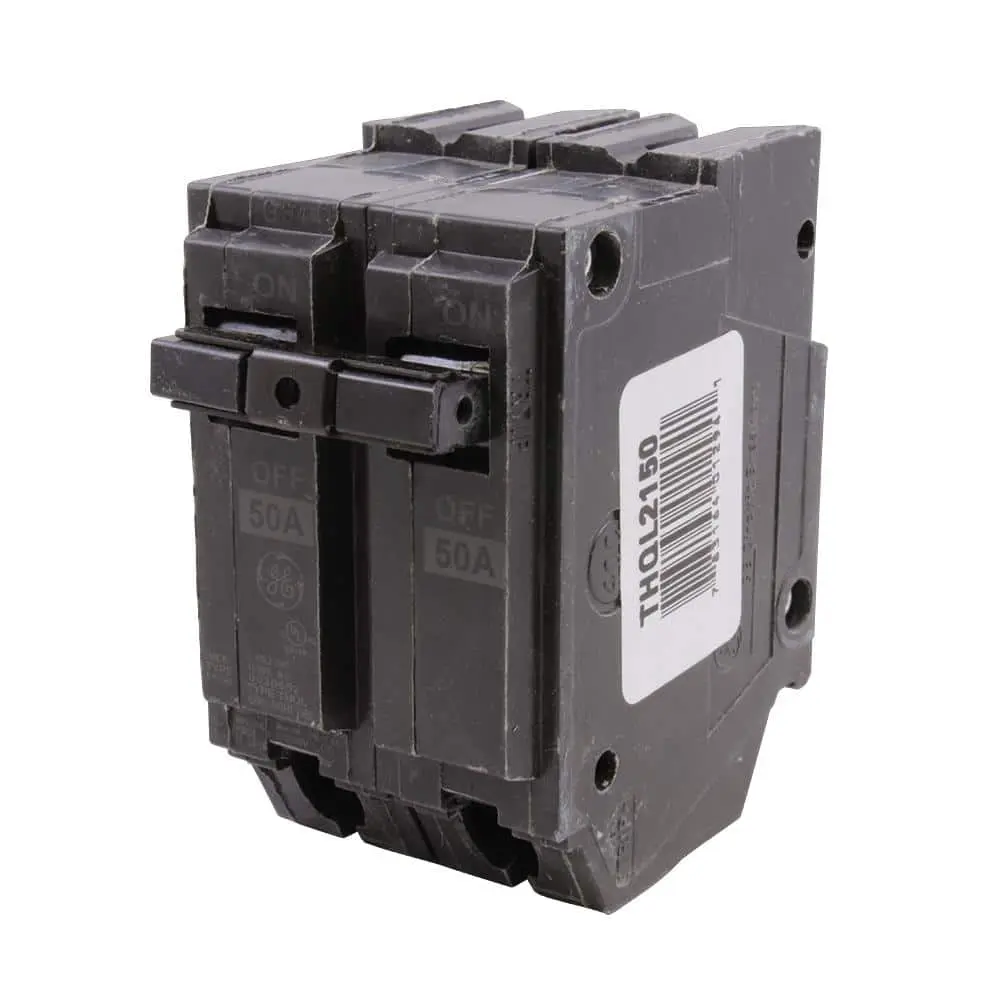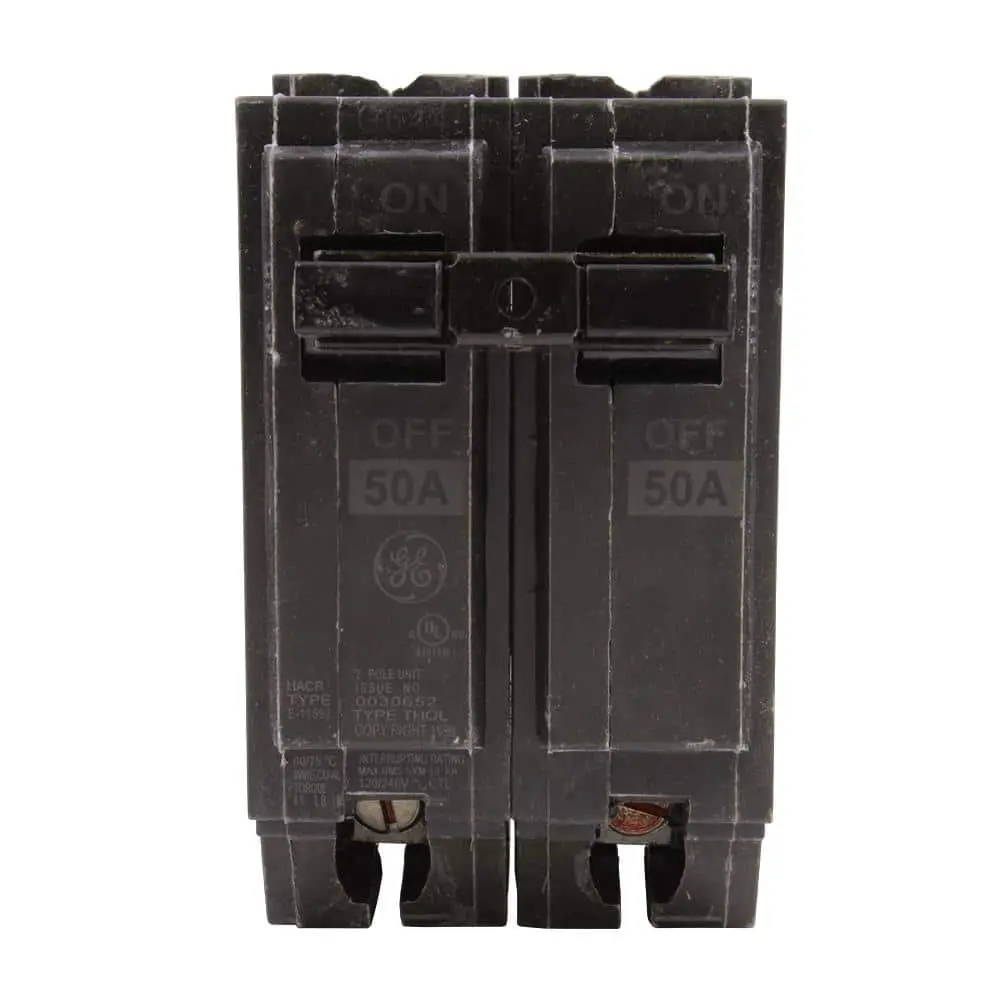 The GE Q-Line 50 Amp 2-Pole Circuit Breaker is built for durability and reliable performance. It features a cemented calibration screw that ensures stability by preventing shifting, resulting in consistent operation. Tin-plated copper stabs provide durable, corrosion-resistant connections, while the heat-resistant thermoset case enhances structural integrity and stability.