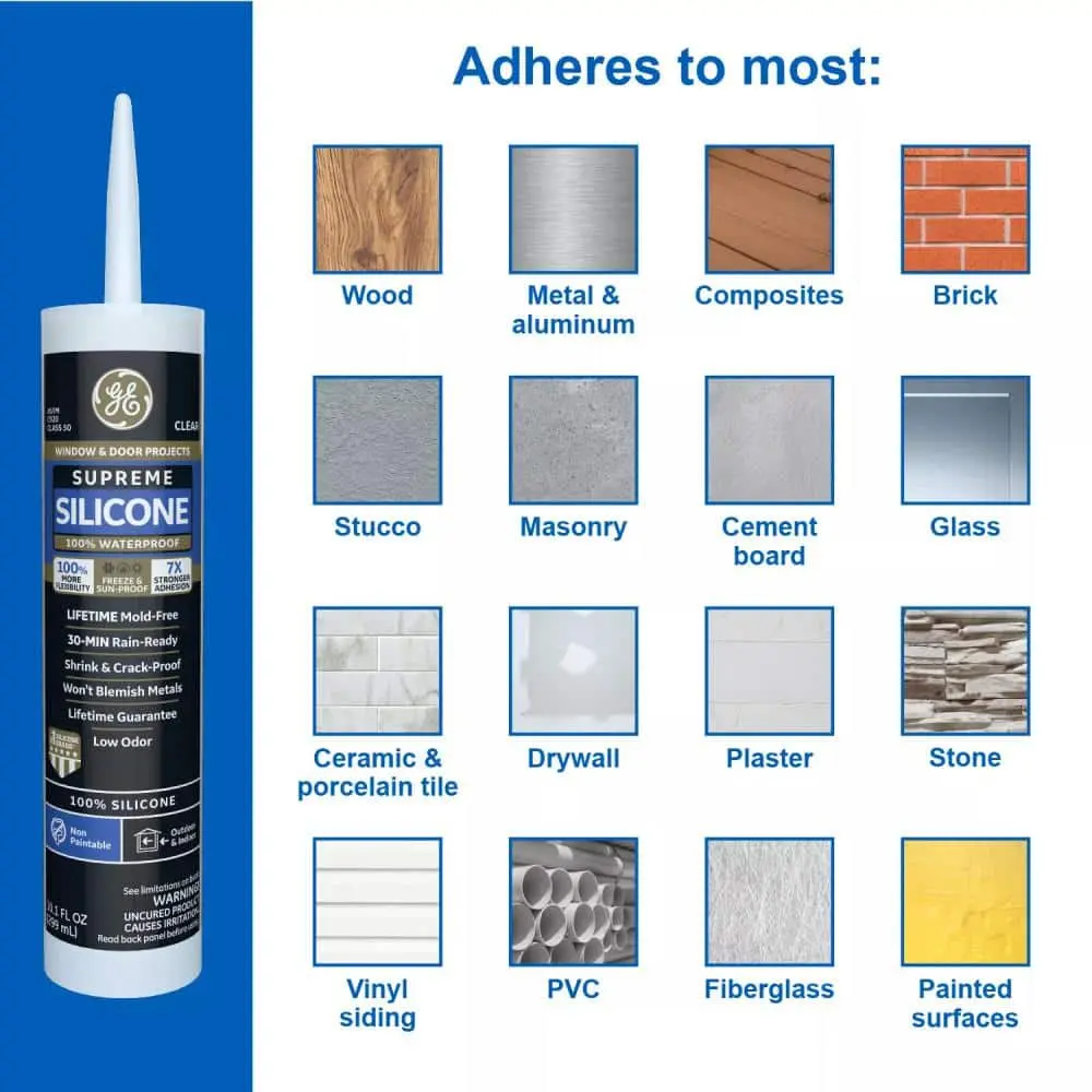 The GE Supreme Silicone Caulk 10.1 oz Window and Door Sealant in white offers a clean and bright finish for your sealing needs. Made from 100% silicone, it provides superior flexibility and durability, ensuring a long-lasting seal. This caulk is weatherproof, able to withstand harsh outdoor conditions, and is also waterproof, providing a strong barrier against water infiltration. Additionally, it is mold and mildew resistant, making it ideal for damp areas, and UV resistant, preventing damage from prolonged sunlight exposure. With these features, it guarantees a tight, durable seal for your windows and doors
