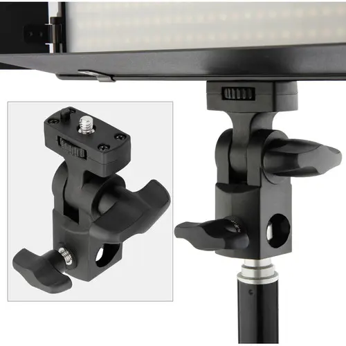 Other features of the light include a color display with controls on the rear, a 1/4"-20 mounting thread on the bottom and sides, and an anti-twist safety pin next to the bottom 1/4"-20 thread. A shoe mount and 5/8" light stand adapter come included for on-camera and C-stand mounting.