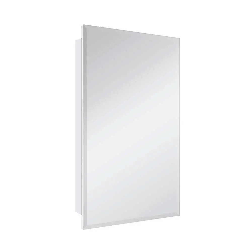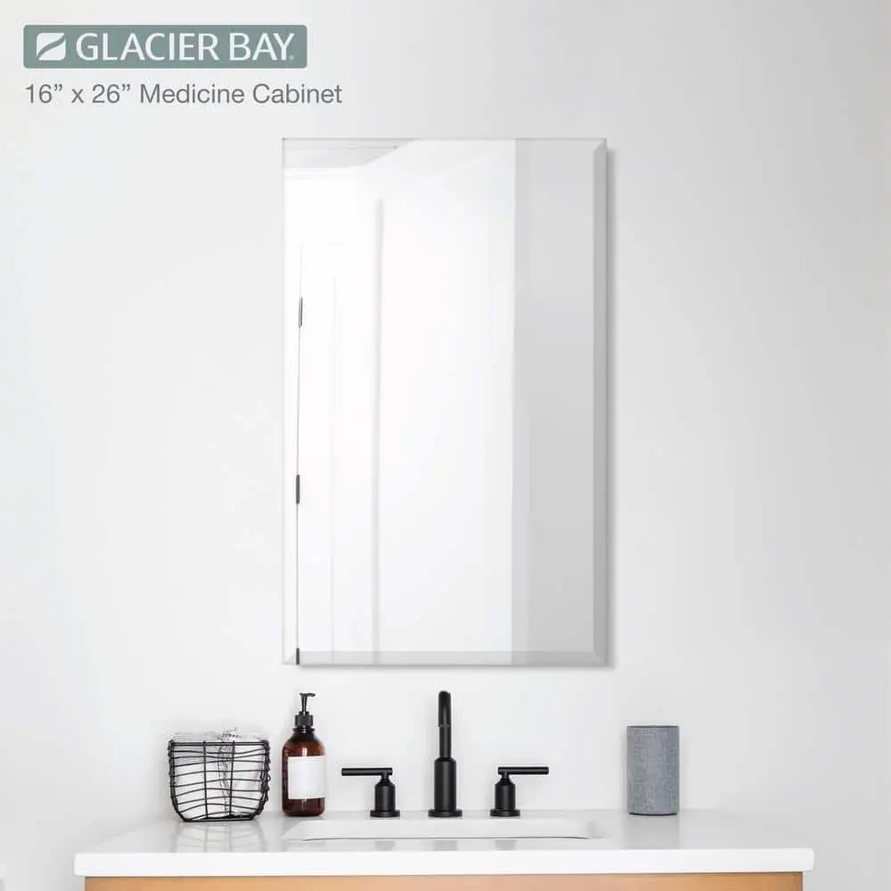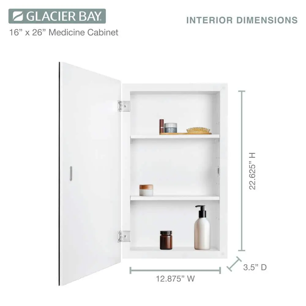 The Glacier Bay 16 in. W x 26 in. H x 4.46 in. D Frameless Bathroom Medicine Cabinet is a versatile and stylish addition to any bathroom. Featuring a .05 in. beveled-edge mirror and a classic frameless design, it offers a sleek, modern look. The cabinet includes 2 adjustable shelves with double shelf pegs for easy customization and ample storage. Its reversible door allows for left or right opening to suit your preference. Made from durable wood composite, it ensures long-lasting strength. The cabinet comes fully assembled for hassle-free installation