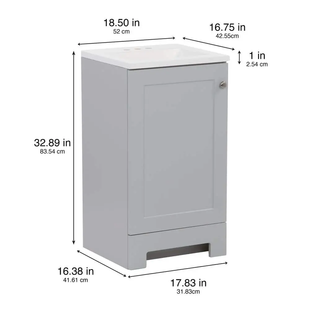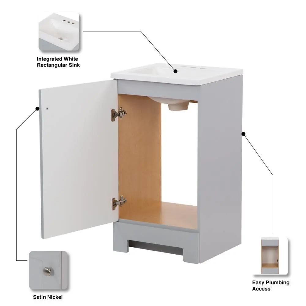 The Glacier Bay 18.5-inch bathroom vanity in pearl gray includes a 1-door cabinet and a white cultured marble top. This freestanding vanity showcases a Shaker-style full-overlay design, enhanced by satin nickel pulls. The predrilled white cultured marble top features an integrated rectangular sink, completing the set. Designed for convenience, this pre-assembled vanity has an open-back design, 6-way adjustable hinges, and an unattached top for easy installation and plumbing access.