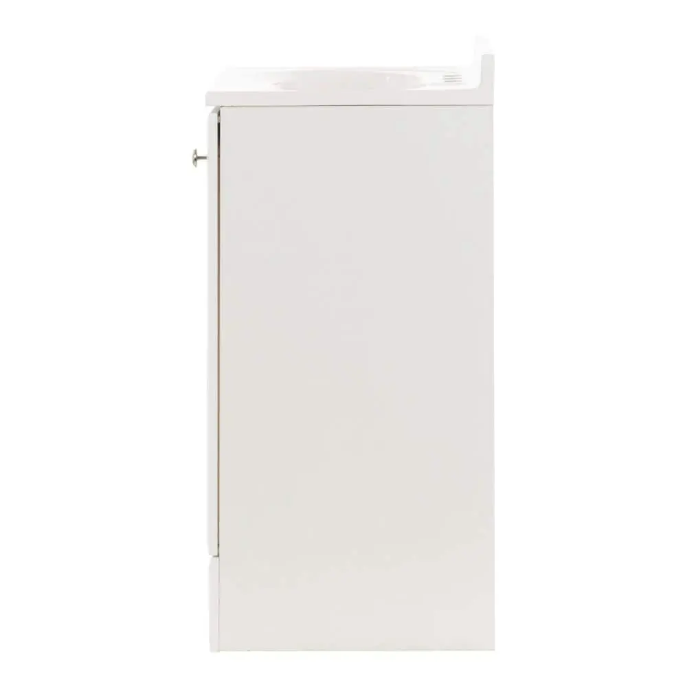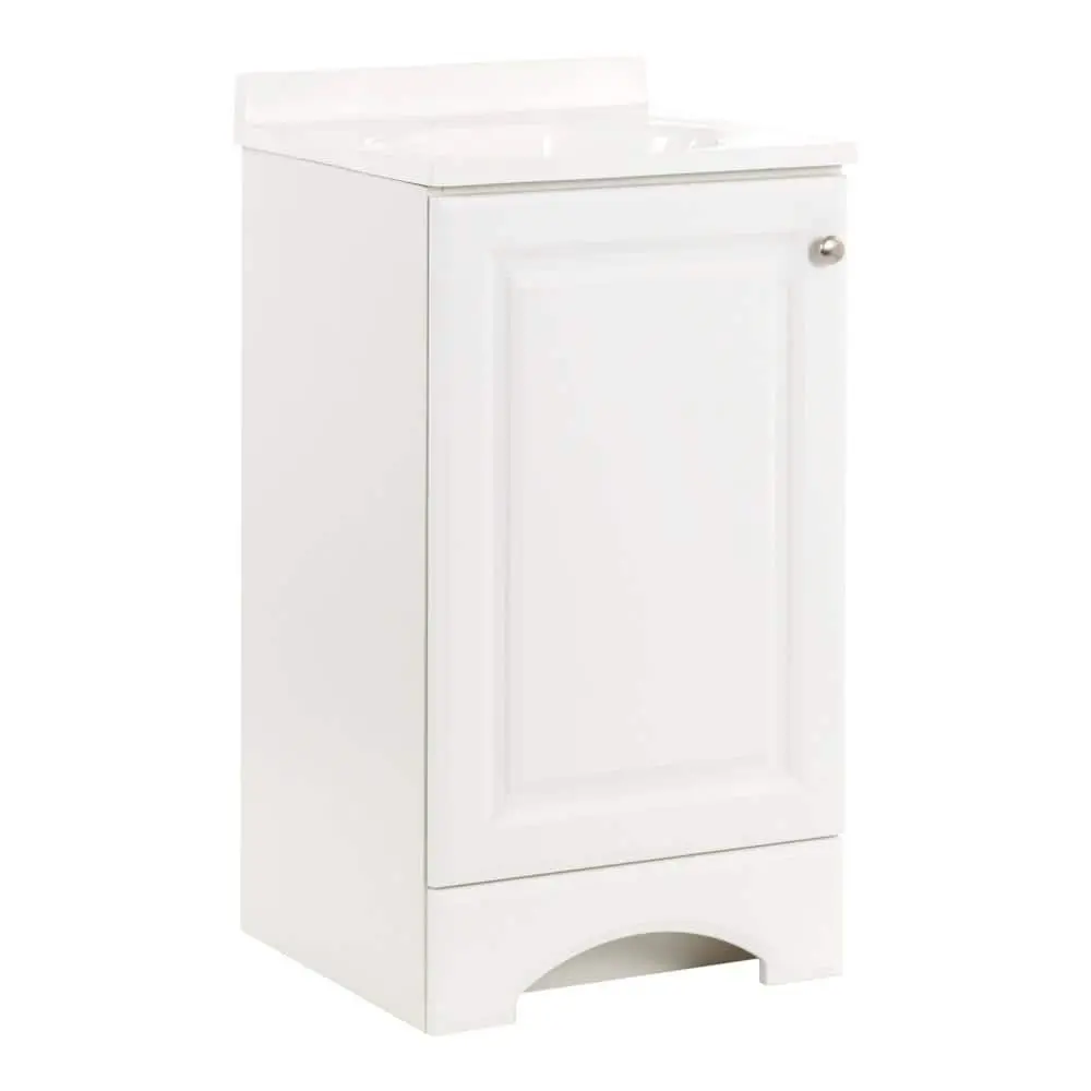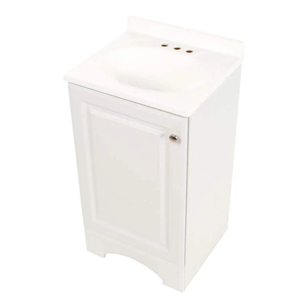 The 18.63-inch W Glacier Bay bathroom vanity in white includes a 1-door cabinet and a white cultured marble top. This freestanding vanity showcases a full-overlay raised-panel design, complemented by satin nickel pulls for a classic appearance. The predrilled white cultured marble top features an integrated oval sink, completing the set. Designed for convenience, this pre-assembled vanity has an open-back design, 6-way adjustable hinges, and an unattached top for easy installation and plumbing access.