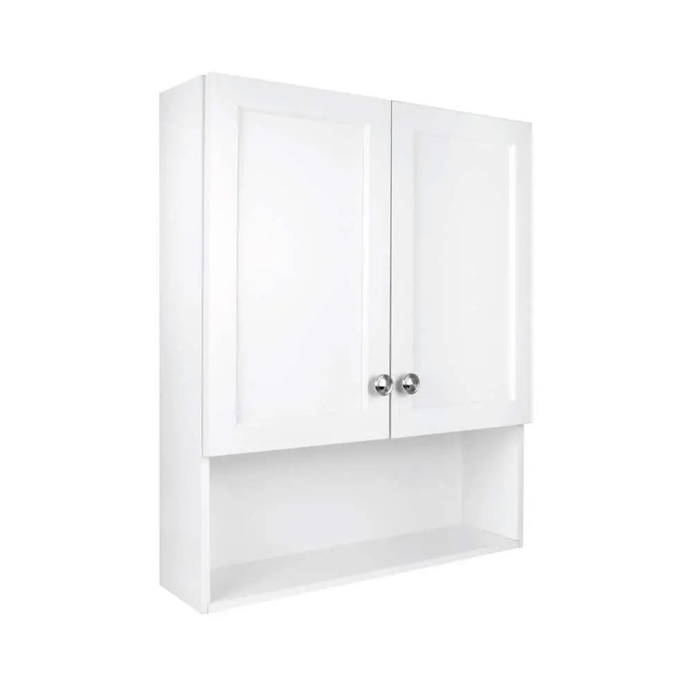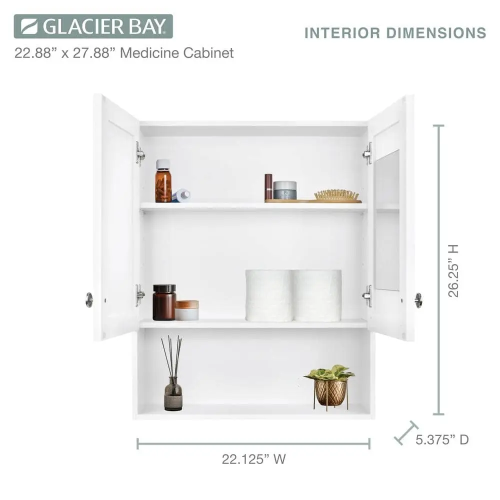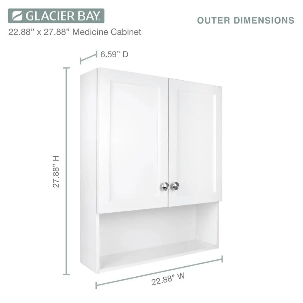 The Glacier Bay 22.88 in. W x 27.88 in. H x 6.59 in. D white shaker-framed surface-mount bathroom medicine cabinet with satin nickel pull knobs is an excellent addition to any bathroom or powder room. Its open shelf design allows you to display decorative items, while the adjustable interior shelf offers flexible storage options. Shelf pegs make it easy to customize your cabinet. Crafted from wood composite, this cabinet ensures exceptional durability and strength. It comes fully assembled for your convenience.