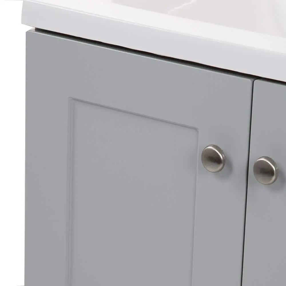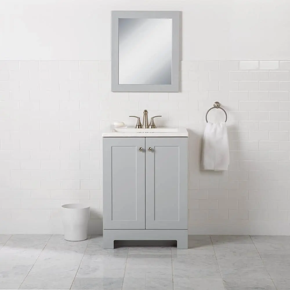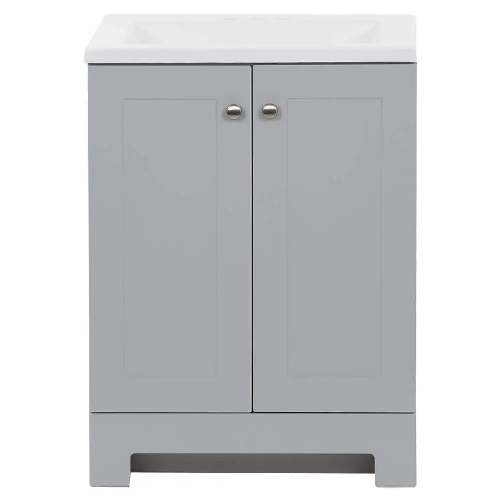 The 24.5-inch Glacier Bay bathroom vanity in pearl gray includes a 2-door cabinet and a white cultured marble top. This freestanding vanity showcases a Shaker-style full-overlay design, enhanced by satin nickel pulls. The predrilled white cultured marble top features an integrated rectangular sink, completing the set. Designed for convenience, this pre-assembled single-sink vanity has an open-back design, 6-way adjustable cabinet hinges, and an unattached top for easy installation.
