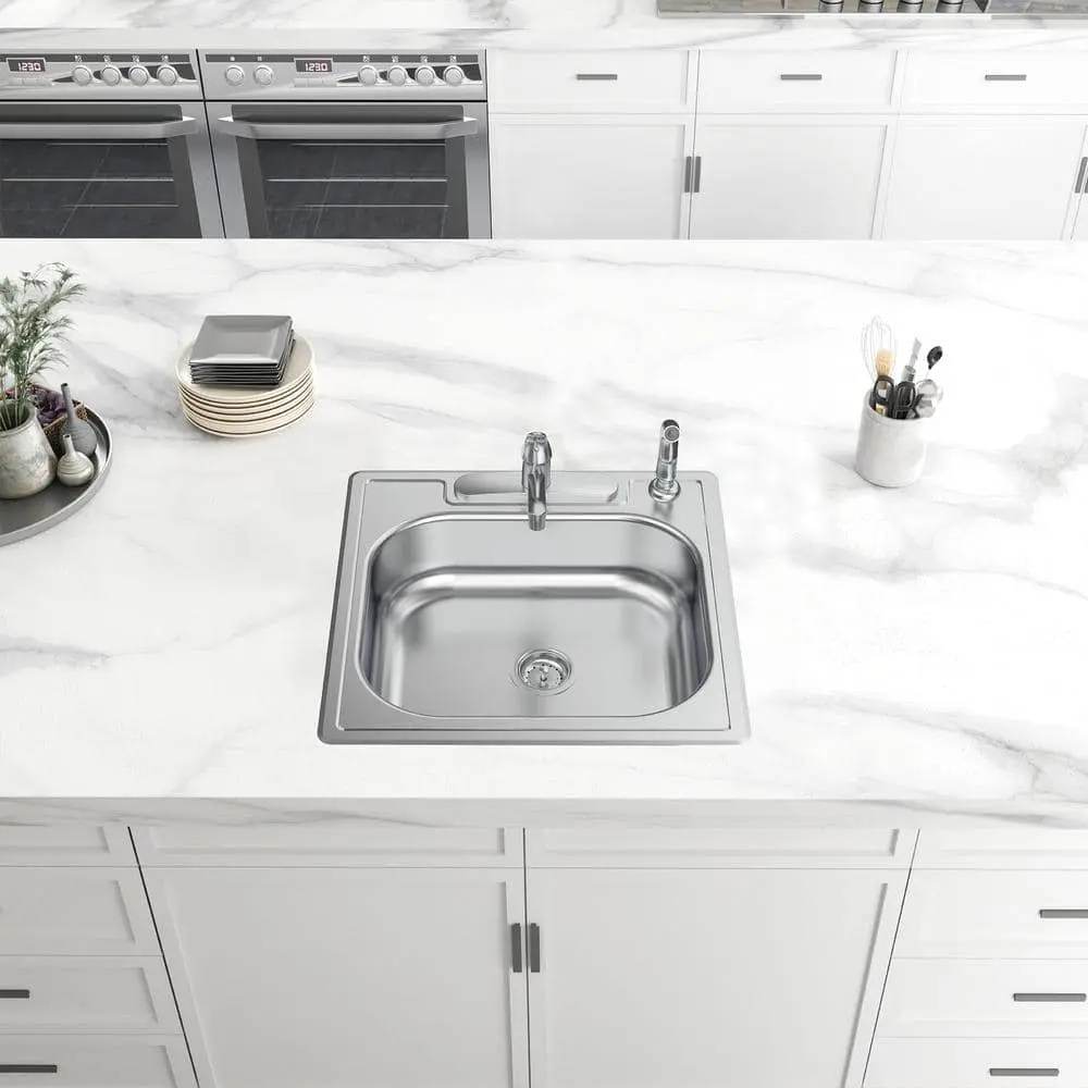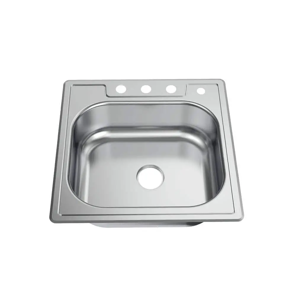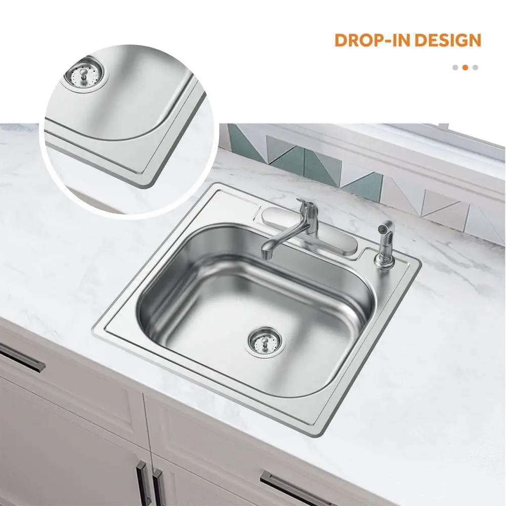 The Glacier Bay 25 in. x 22 in. single bowl drop-in kitchen sink is crafted from durable stainless steel with a buffed satin finish. Designed to enhance your kitchen's style, it combines both durability and practicality. The sink includes four pre-drilled faucet holes and features an undercoating that reduces noise and helps prevent condensation buildup.