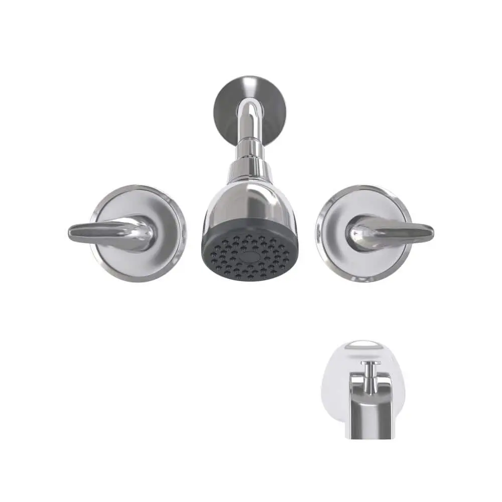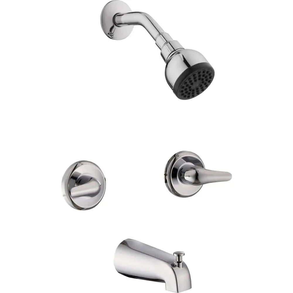 The Glacier Bay Aragon 2-handle 1-spray tub and shower faucet in chrome offers a classic blend of practicality and style, enhancing any bathroom decor. WaterSense certified, it effectively reduces water usage, while washerless cartridges guarantee smooth operation and durability. The timeless two-handle lever design allows for precise control over water flow and temperature, and the user-friendly single-function shower head simplifies your showering experience. With its durable, easy-to-clean chrome finish, this faucet ensures a consistent temperature for a safe and enjoyable shower.