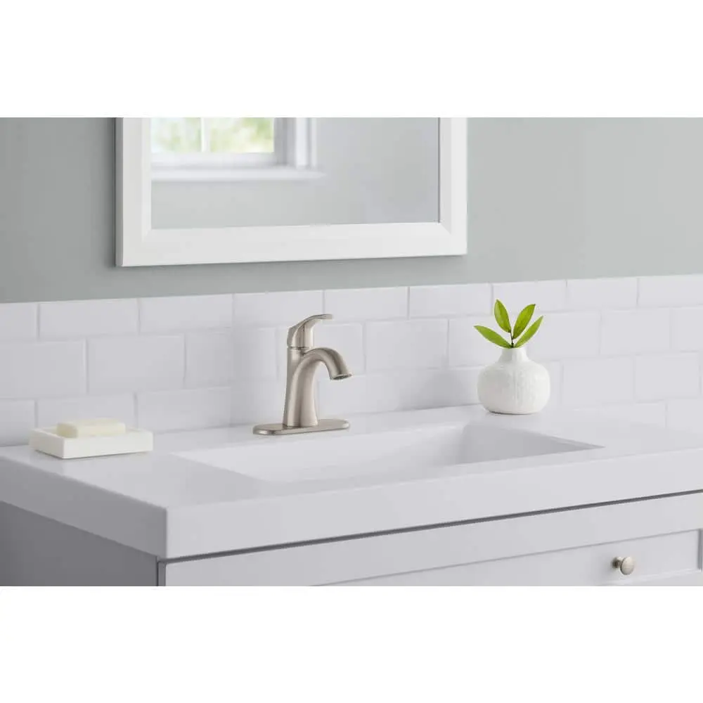 The Glacier Bay Arnette Single Hole Single-Handle Bathroom Faucet in Brushed Nickel offers a clean and streamlined design, making it a great fit for styles ranging from coastal cottage to urban cool. Featuring a blend of gentle curves and clean lines, this faucet is an ideal choice for both a simple refresh or a full remodel, enhancing your bathroom's aesthetic. Update your space with this beautiful faucet for a modern touch
