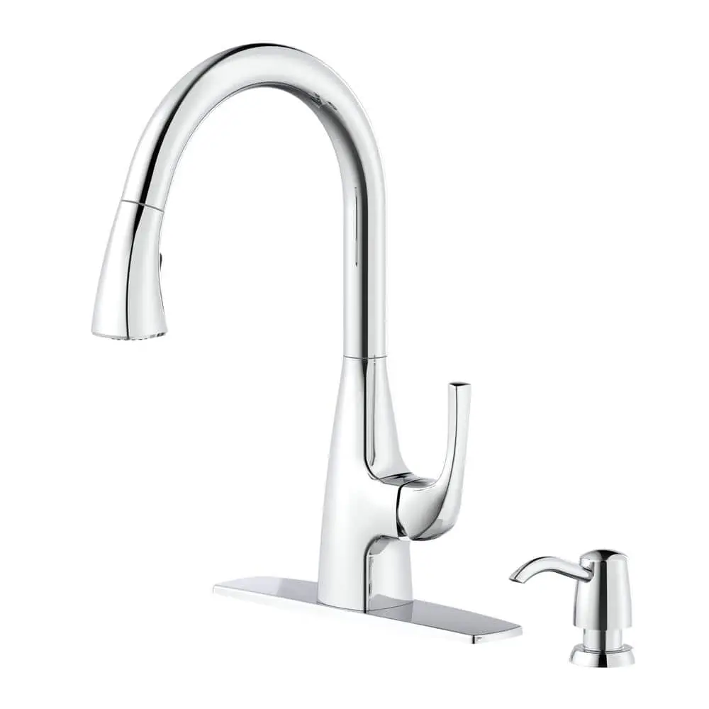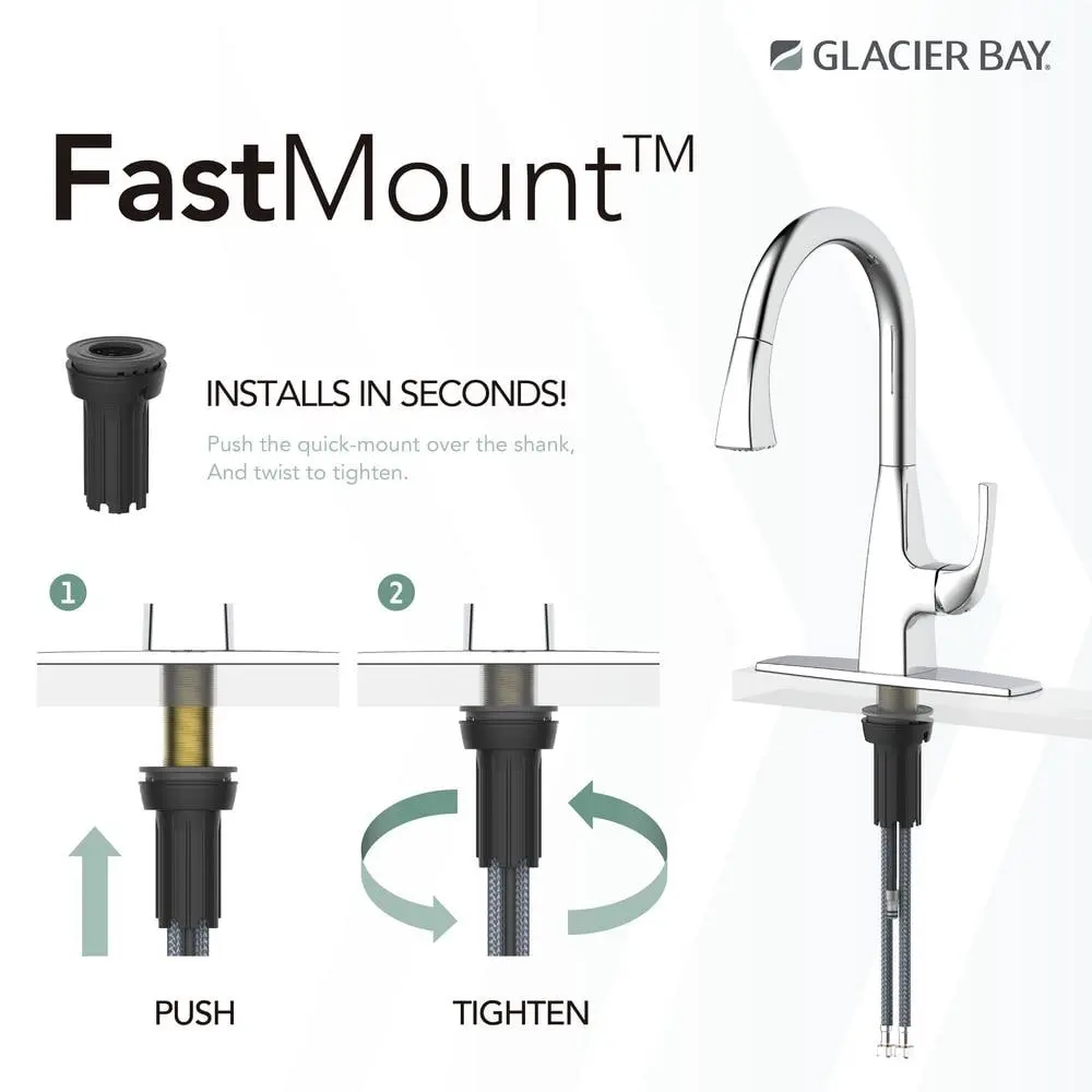Update your kitchen with the sleek and contemporary Calendine Single Handle Pulldown Kitchen Faucet, featuring smooth, sculpted edges and a built-in soap dispenser. The pull-down operation offers flexibility, with a dual-function sprayer on a swivel connection for easy access to every corner of your sink in one fluid motion. Installation is quick and hassle-free thanks to the exclusive Glacier Bay FastMount system.