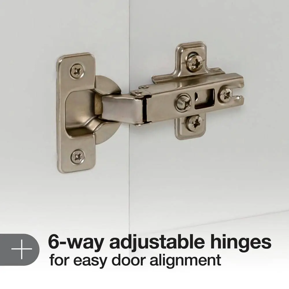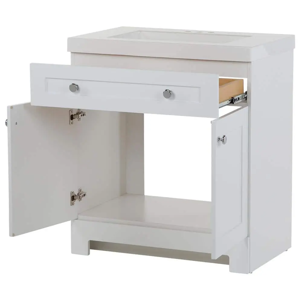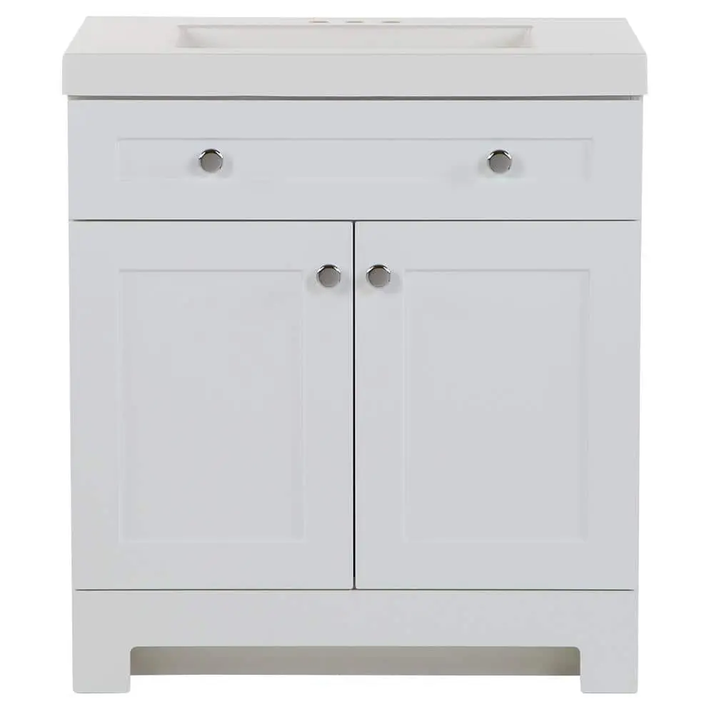 The 30.5-inch W Everdean vanity in white includes a two-door cabinet, a below-the-sink drawer, and a white cultured marble vanity top. Designed to maximize storage in small spaces, it features a full-extension, three-compartment drawer for easy access to toiletries and plumbing. This freestanding vanity showcases a full-overlay design with Shaker-style door and drawer profiles, enhanced by polished chrome pulls. The pre-drilled white cultured marble vanity top comes with an integrated rectangular sink. Created for convenience, this pre-assembled bathroom vanity has an open-back design, a wrap-around drawer with an adjustable front, adjustable hinges, and an unattached vanity top for straightforward plumbing access and installation.