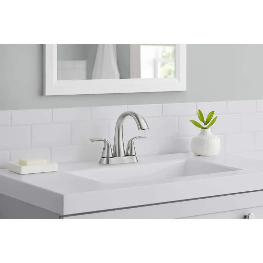 The Irena 4 in. Centerset Double-Handle High-Arc Bathroom Faucet in Brushed Nickel offers a graceful and timeless design that complements modern aesthetics, adding a perfect finishing touch to your bathroom. Its simple yet elegant style harmonizes with any decor choice you make. Crafted with durable materials, this faucet is built to provide years of reliable use.