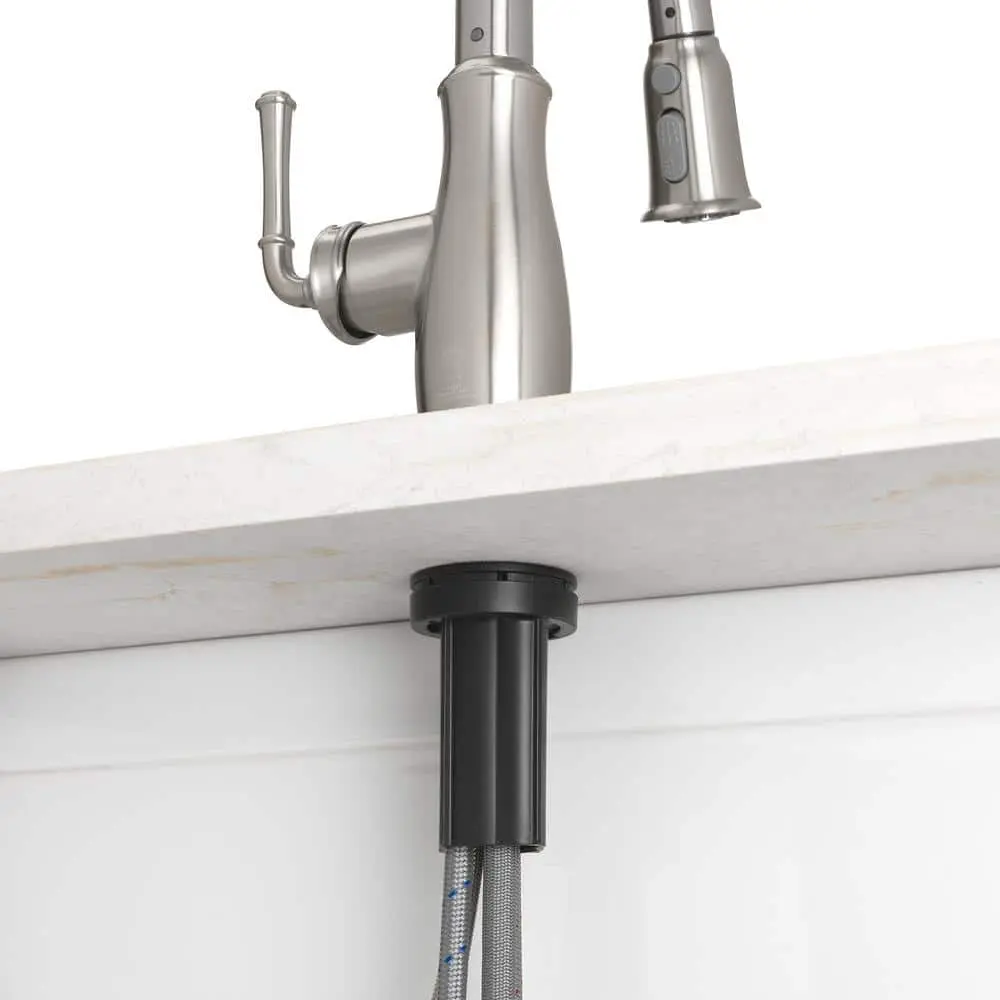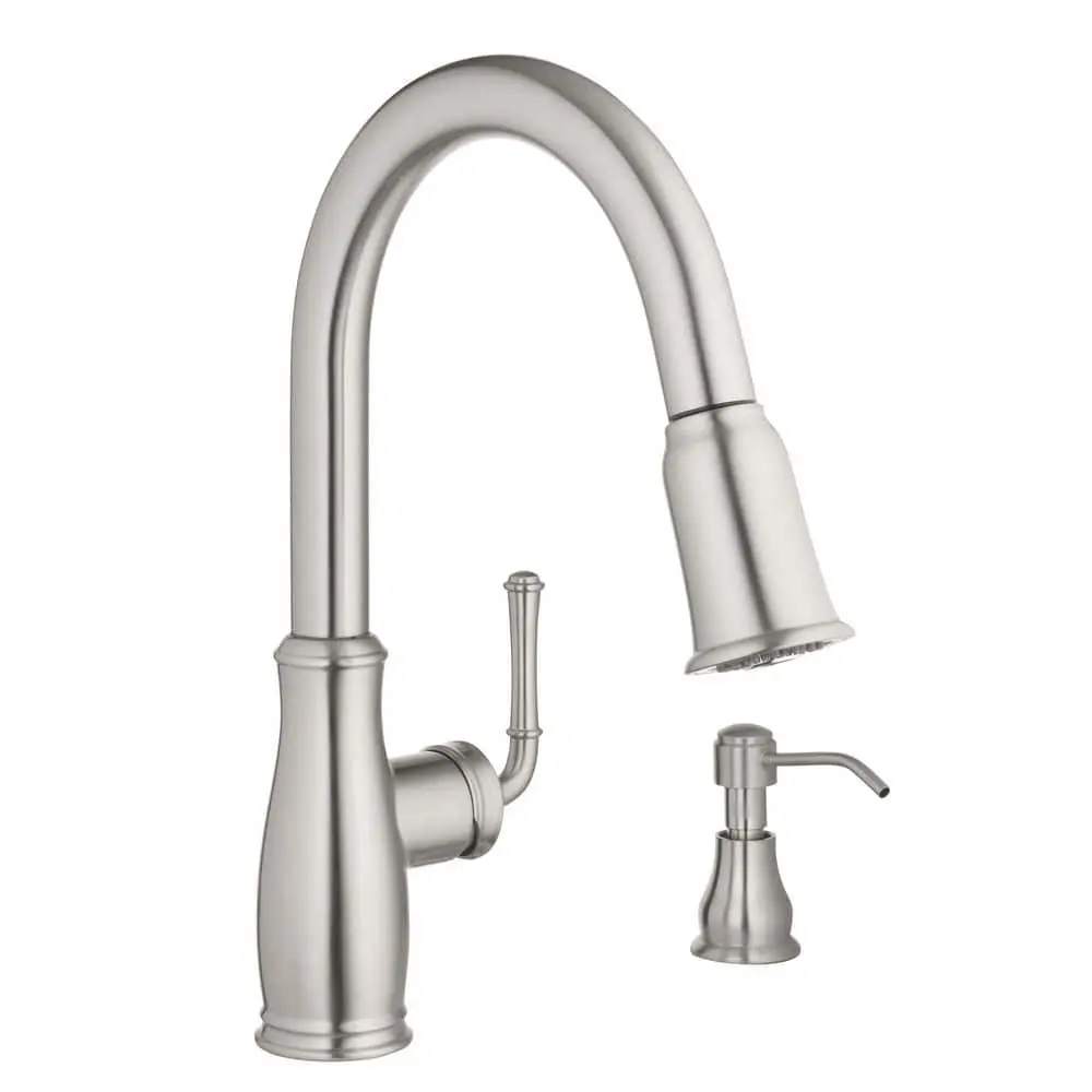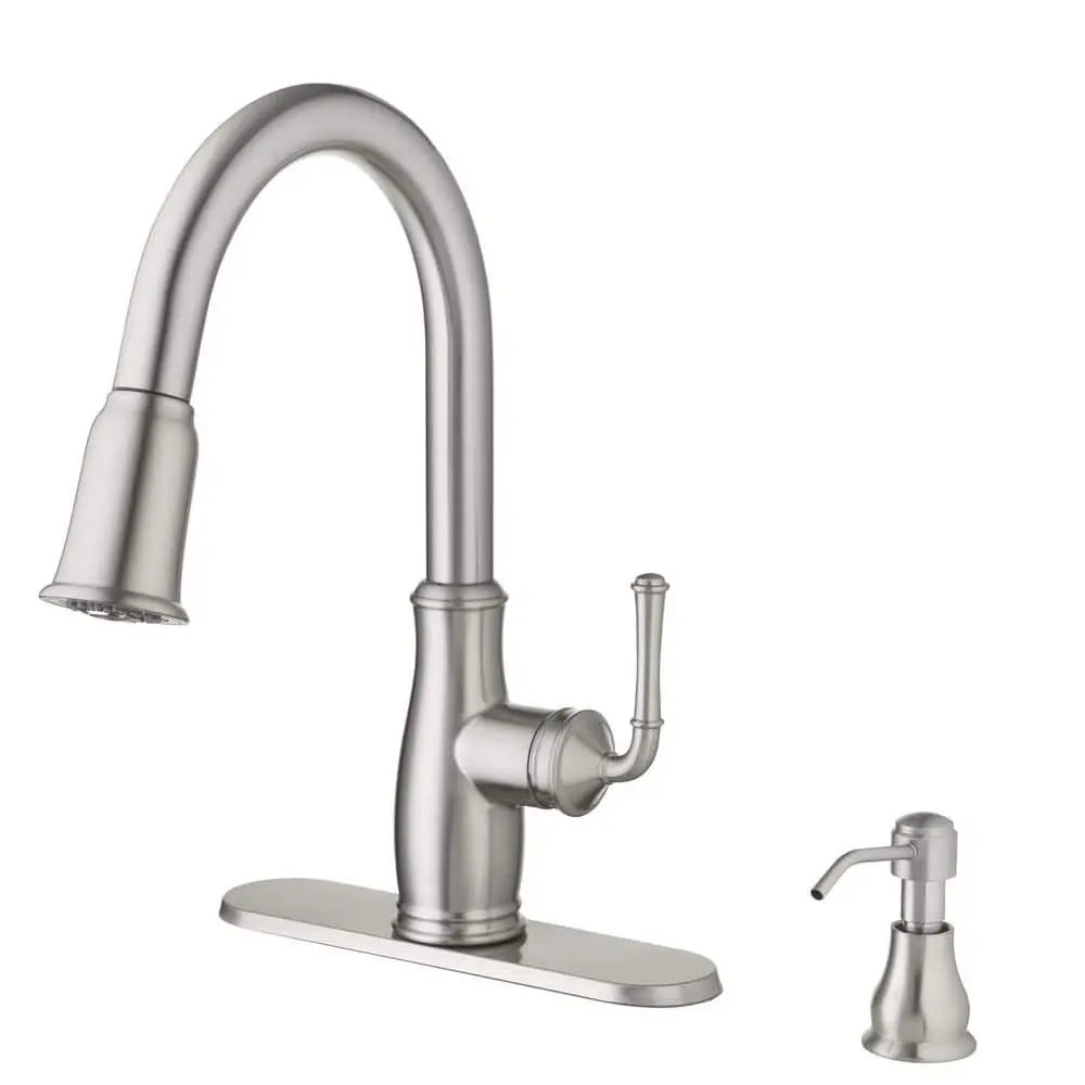 The Glacier Bay Kagan single-handle kitchen faucet features a high arc design, 360-degree swiveling spout, and retractable pull-down sprayer, making it easy to fill large pots and clean dishes. It includes a dual-function spray head with stream and spray settings and a 1.8 GPM flow rate. The faucet comes with a matching soap dispenser and an optional deckplate for compatibility with single, 2, 3, or 4 hole sinks. A durable ceramic disc valve ensures drip-free performance, and FastMount hardware simplifies installation. Built-in 30-inch supply lines are clearly marked for hot and cold water, with recommended installation tools not included.