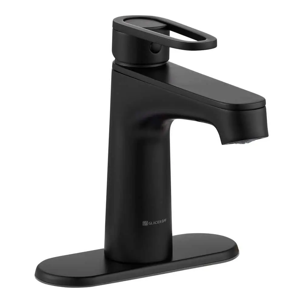 The Glacier Bay Kendrick Single Hole Single-Handle High-Arc Bathroom Faucet in Matte Black features sleek, modern lines that add sophistication to any bathroom. WaterSense certified, it offers a 1.2 GPM flow rate to help reduce water usage, while the ceramic disc valve ensures drip-free performance. Designed for ease of use, it includes a metal lever handle for precise control and a high-arc spout that provides ample sink space. Additionally, this faucet comes with a push-down pop-up drain assembly for convenience